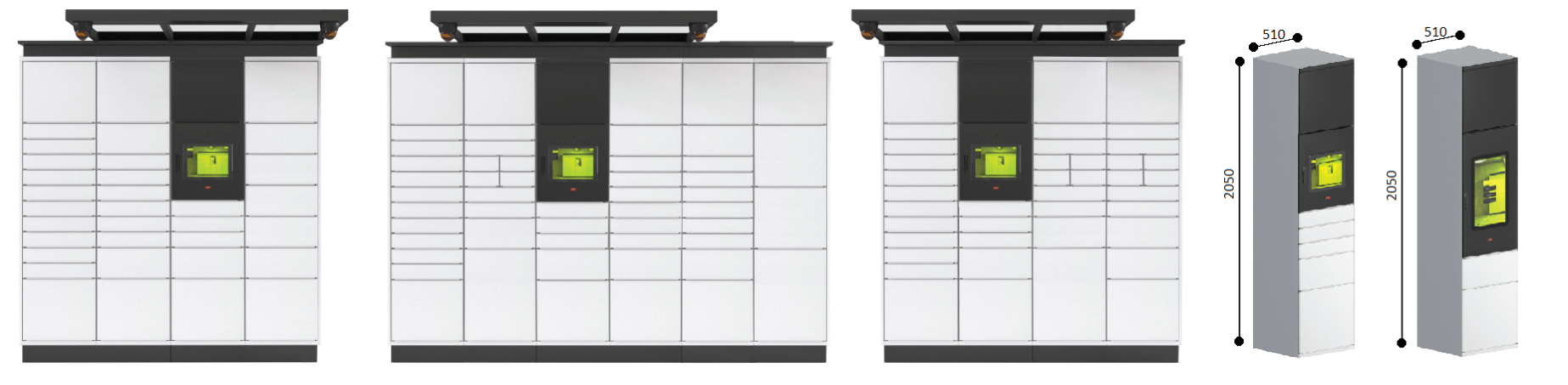 Основные модули почтомата состоят из терминальной колонны и почтовой колонны с ячейками разного размера. Терминальная колонна в свою очередь поставляется с двумя вариантами основных экранов: серия Standart (экран размером 15,6 дюймов) и серия Pro (экран размером 21 дюйм). Глубина колонны также выбирается клиентом из двух стандартных величин: 500 или 700 мм.