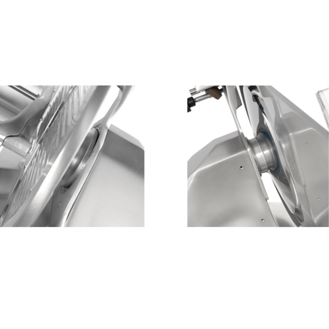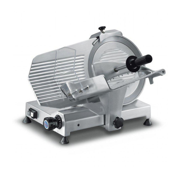 Корпус прибора выполнен из прочного алюминия. Для устойчивости на дне слайсера установлены противоскользящие ножки. Запитывается прибор от сети 220 В, уровень потребляемой мощности составляет 0,12 кВт. Для удобства оператора на корпусе предусмотрены рукоятки с удобным хватом. Нарезка производится дисковым ножом диаметром 300 мм. В комплект поставки включено заточное устройство для поддержания его остроты.