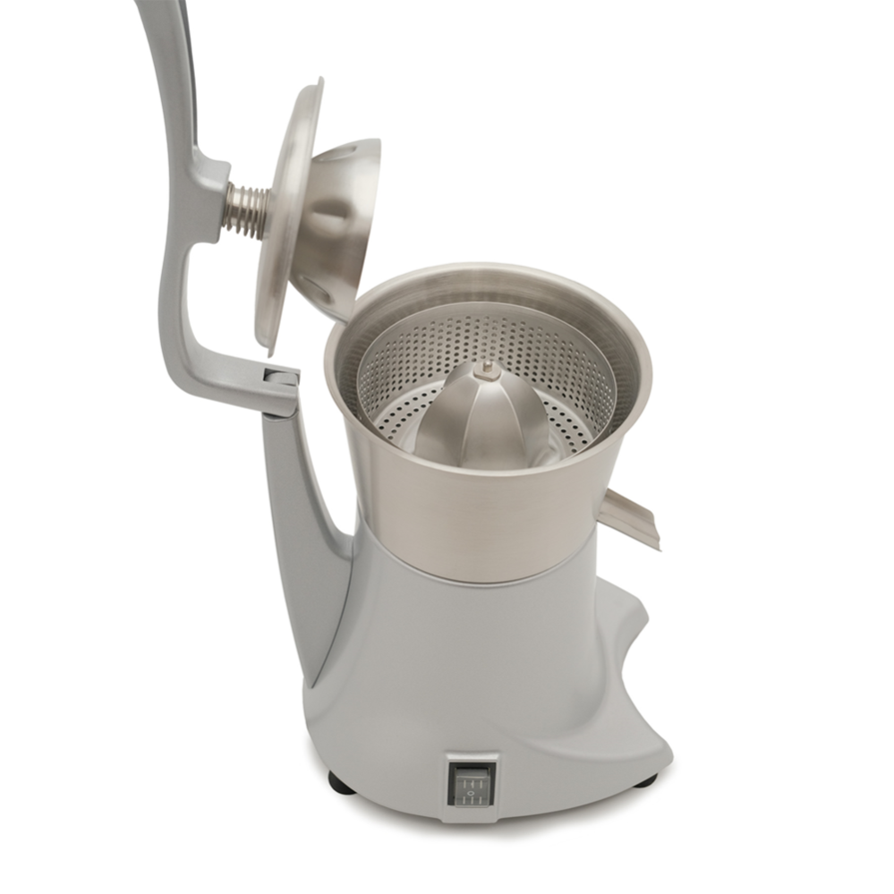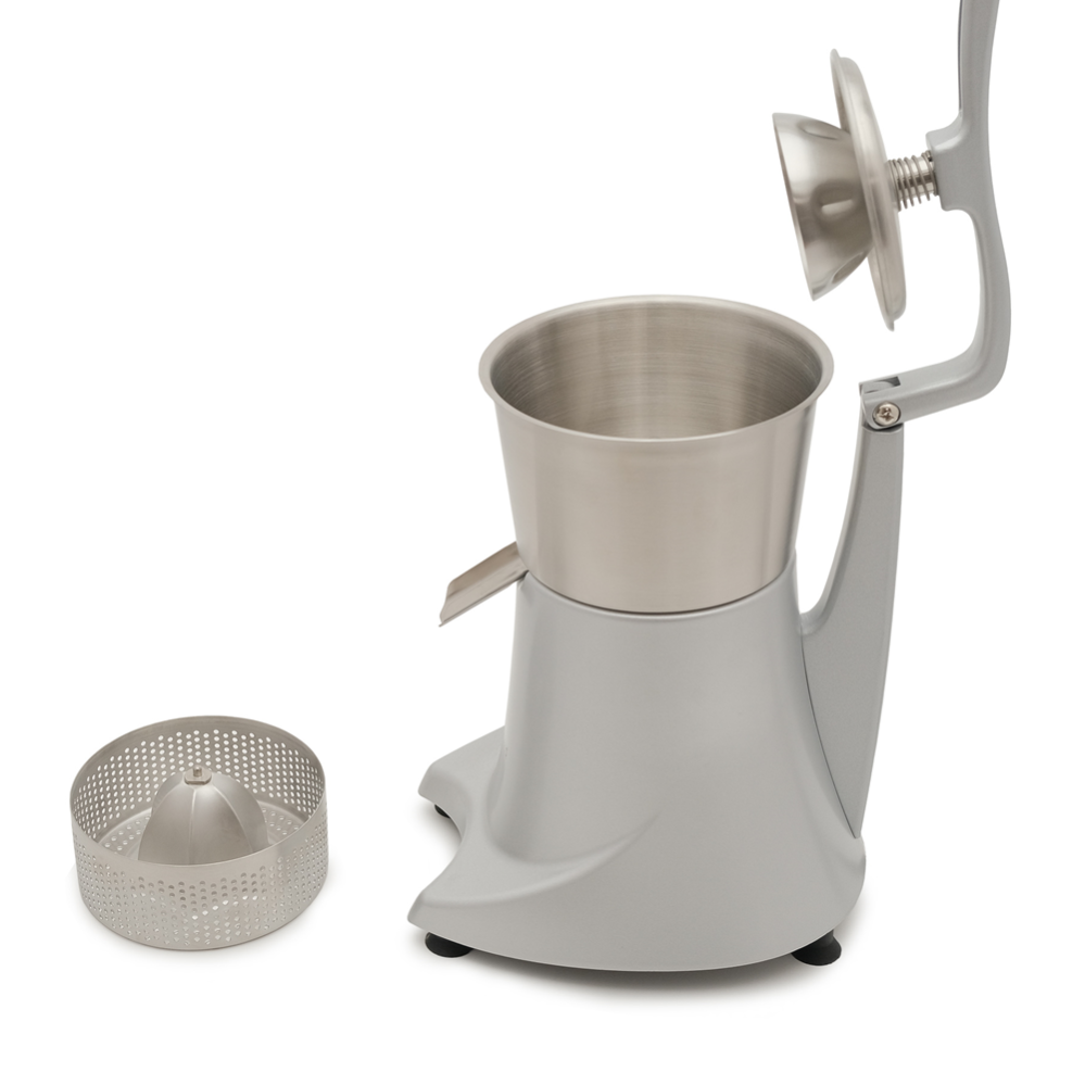 Корпус изготовлен из алюминия, что обеспечивает прочность и долговечность прибора, а чаша и конус — из нержавеющей стали, что гарантирует гигиеничность и легкую очистку. Сито с мелкими отверстиями позволяет быстро отделять сок от мякоти, сохраняя высокую производительность.