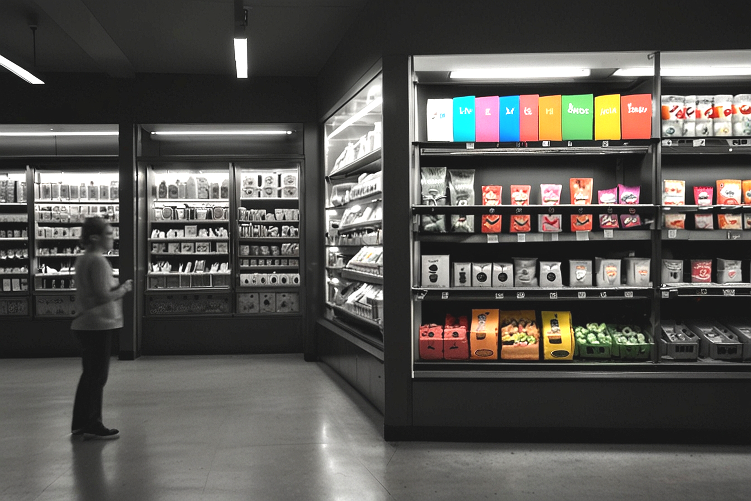 Чтобы акцентировать внимание покупателей, можно использовать разные способы. И необязательно придумывать что-то сложное. Например, в магазинах с продуктами, зачастую, используется стандартный набор акцентов: цвет, распродажа, освещение, выкладка.
