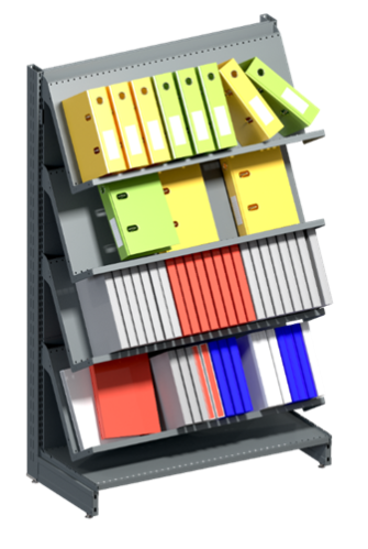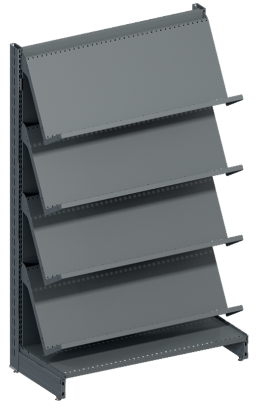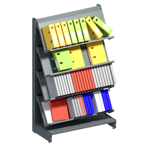 Стеллаж предоставляет отдельные полки или отсеки, расположенные под наклоном, которые позволяют легко разделить и организовать канцелярские принадлежности с удобной обзорностью для покупателей.