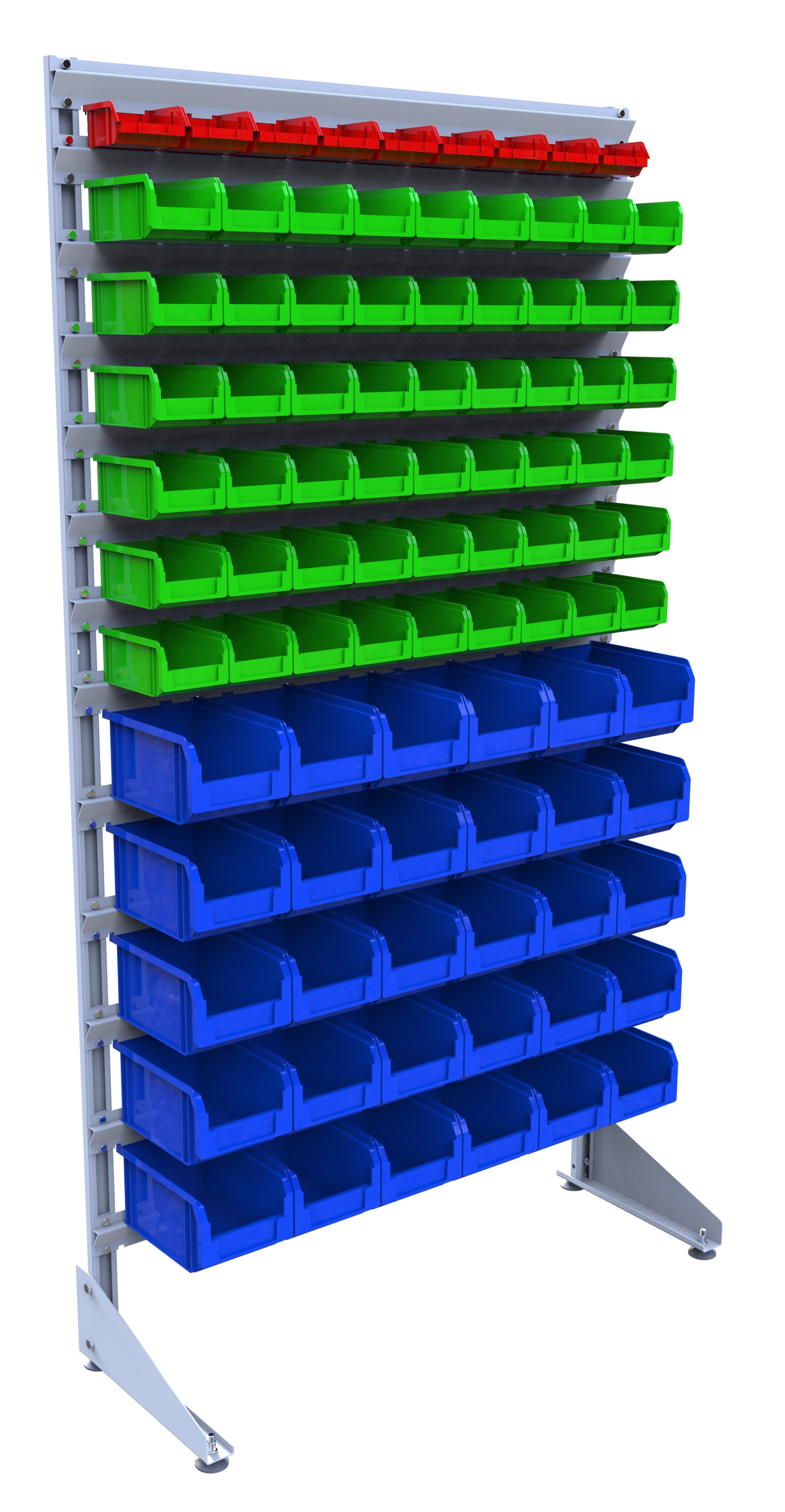 - Пластиковые лотки – серия контейнеров различных типоразмеров, позволяющих комбинировать их расположение на стойках. Ящики крепятся к траверсам и используются для организованной выкладки и хранения различных мелких штучных деталей (метизов, пластиковых изделий, крепежей и пр.). Ящики могут также устанавливаться на полки, которые являются необязательным элементом конструкции, но могут фиксироваться на опорную стойку.
