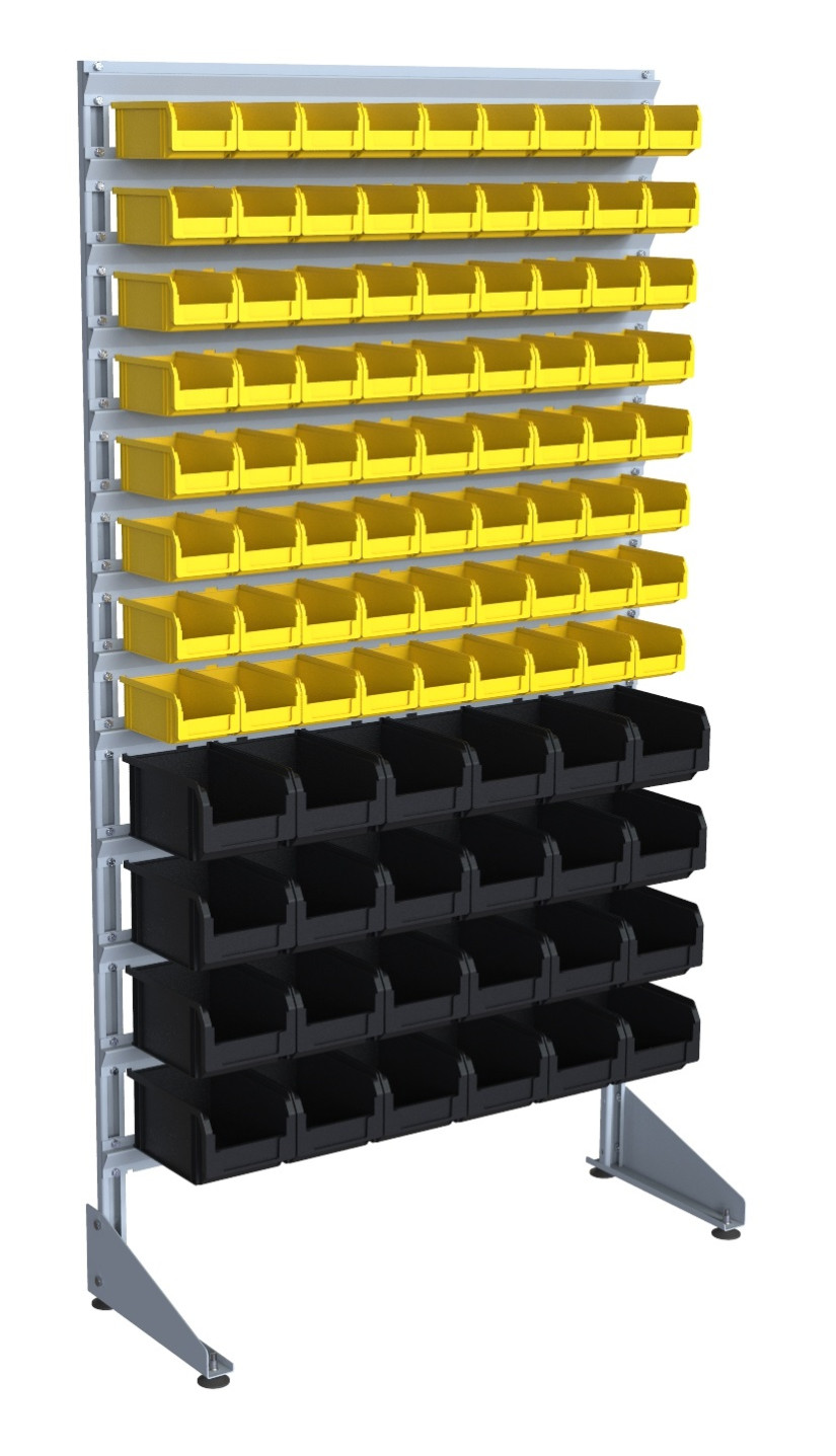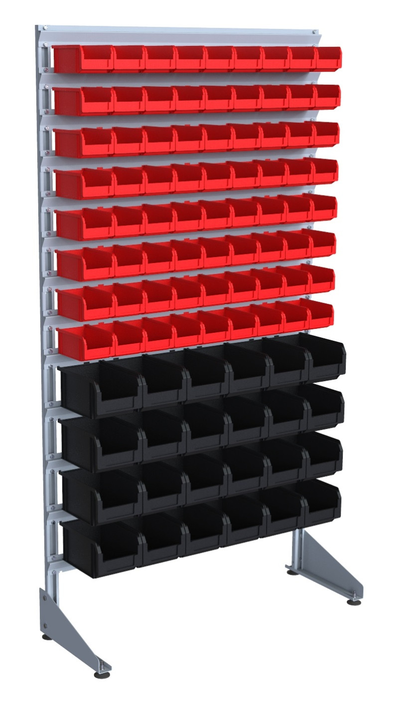 - Пластиковые лотки – серия контейнеров различных типоразмеров, позволяющих комбинировать их расположение на стойках. Ящики крепятся к траверсам и используются для организованной выкладки и хранения различных мелких штучных деталей (метизов, пластиковых изделий, крепежей и пр.). Ящики могут также устанавливаться на полки, которые являются необязательным элементом конструкции, но могут фиксироваться на опорную стойку.