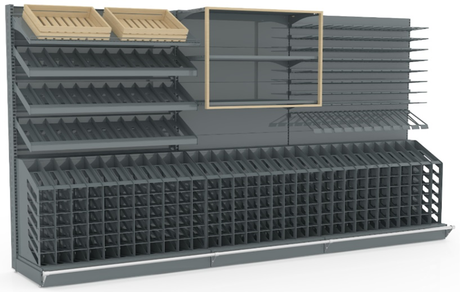 Торговые стеллажи для вина из дерева и металла могут быть укомплектованы специальными полками с разделенными ограничителями секциями. Каждая секция позволяет разместить одну бутылку вина под правильным для хранения наклоном (когда вино касается пробки). Ограничители по бокам не дают скатываться бутылкам, и создают идеальную систему организации, где каждый товар лежит отдельно. Также помимо этого полки с секциями делают стеллаж для вина металлический более аккуратным – его эстетичный вид будет хорошо вписываться в помещение магазина.