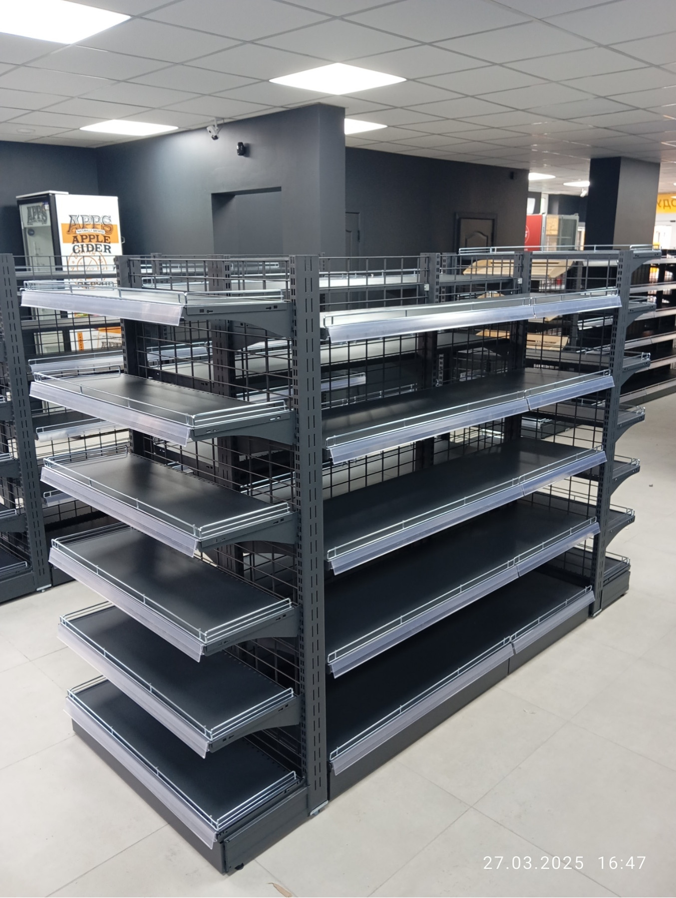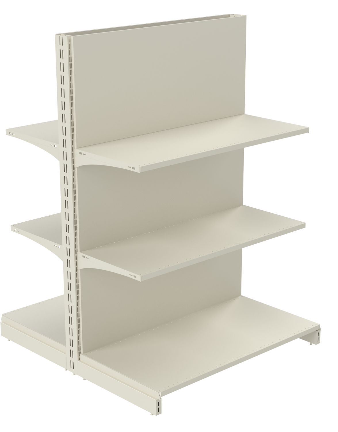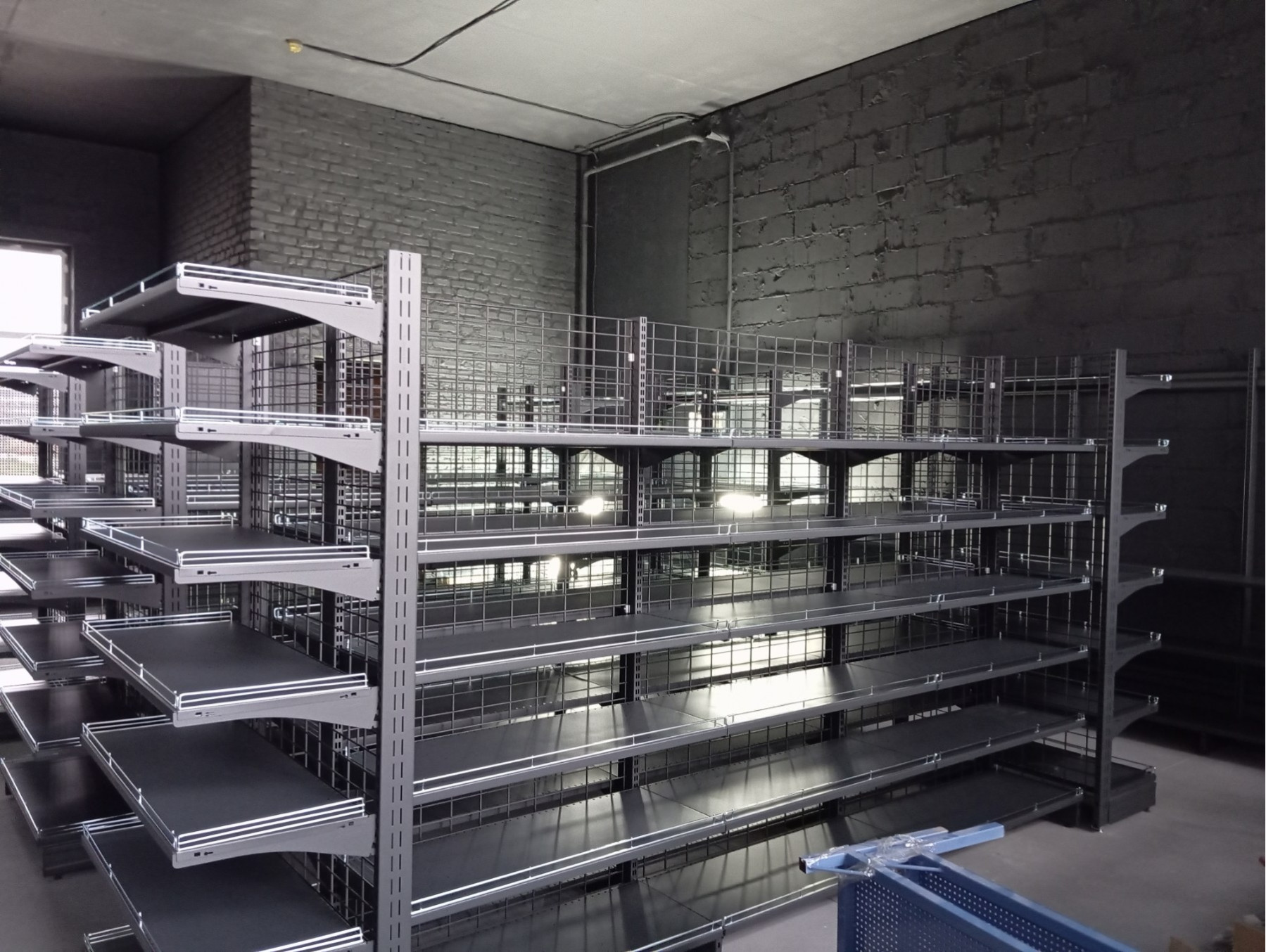 Торговые двухсторонние стеллажи могут использоваться для создания длинного ряда для разделения торгового зала на зоны. Однако стоит учесть, что вам понадобиться стеллаж островной двухсторонний торцевой для замыкания ряда подобного оборудования.