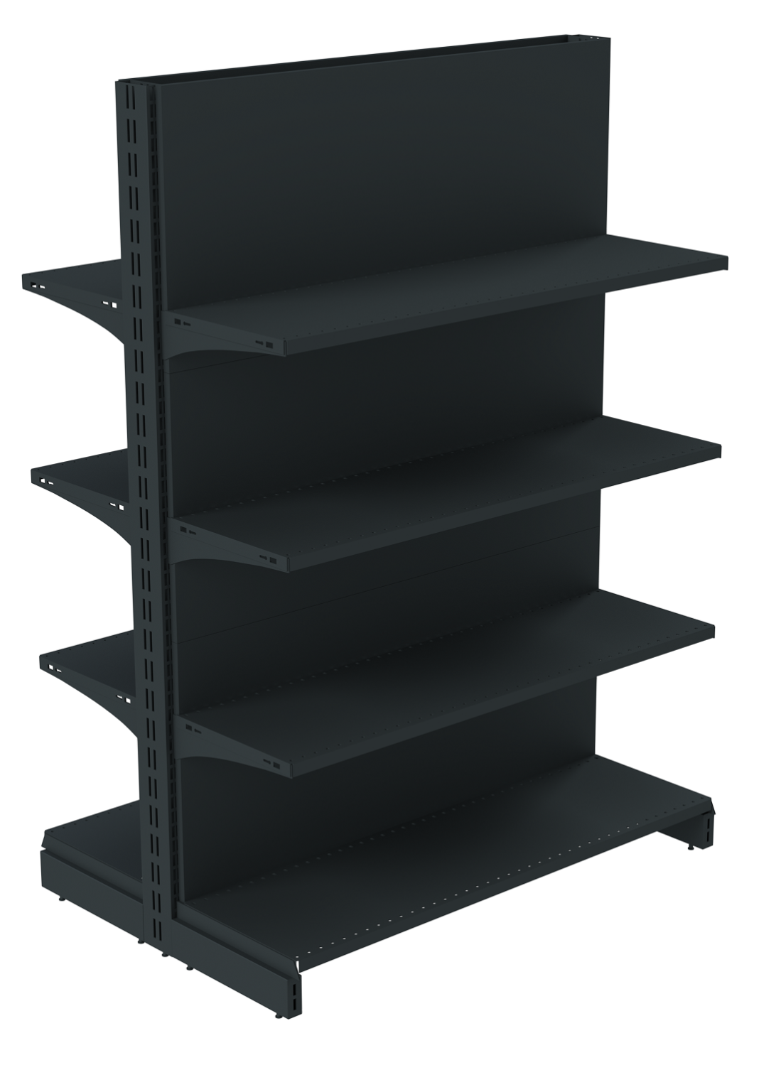5. Полки – основная часть для выкладки товара на островной стеллаж. Устанавливаются полки на двухсторонние стеллажи с помощью кронштейнов, которые крепятся в пазы на торце вертикальных стоек. Кронштейны могут быть как статичными перпендикулярными, так и фиксироваться под определенными углами (угол может быть выбран заказчиком).