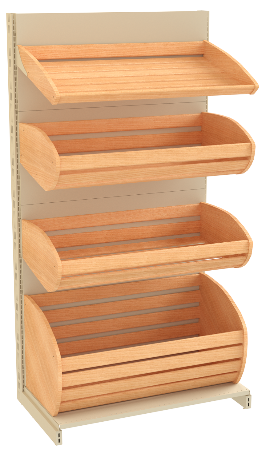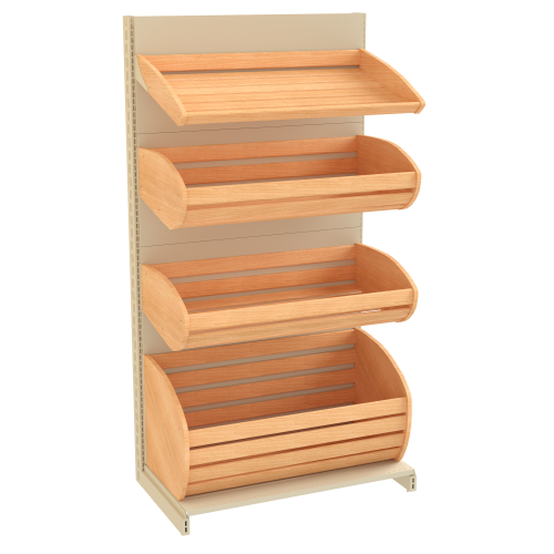 Хлебные стеллажи отличаются от аналогичного торгового оборудования наличием аккуратных, вместительных и красивых деревянных корзин для хлеба. Они размещаются на приемлемой для покупателей высоте, а также позволяют предоставить свободный доступ к хлебобулочным изделиям. Хлебный стеллаж из дерева достаточно практичный и многофункциональный. Он обладает красивым внешним видом, который способствует повышению лояльности у покупателей и увеличению продаваемости.