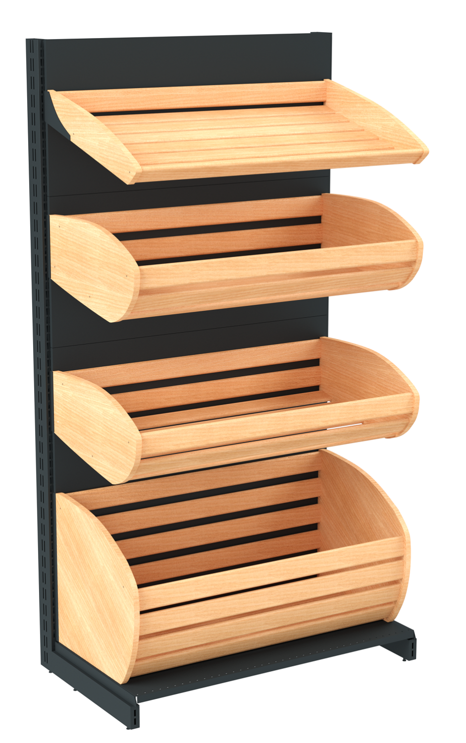 Хлебные стеллажи отличаются от аналогичного торгового оборудования наличием аккуратных, вместительных и красивых деревянных корзин для хлеба. Они размещаются на приемлемой для покупателей высоте, а также позволяют предоставить свободный доступ к хлебобулочным изделиям. Хлебный стеллаж из дерева достаточно практичный и многофункциональный. Он обладает красивым внешним видом, который способствует повышению лояльности у покупателей и увеличению продаваемости.