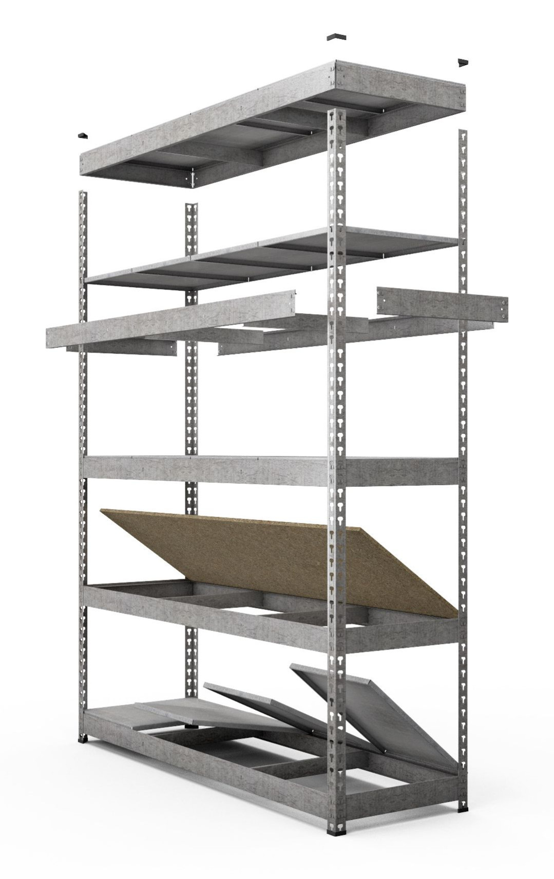 Стеллажи КМ 400 собираются с помощью болтовых соединений и представляют собой рамную конструкцию, на которую закрепляются траверсы. Каркас стеллажа покрывается порошково-полимерным покрытием, полки доступны в трех вариантах: