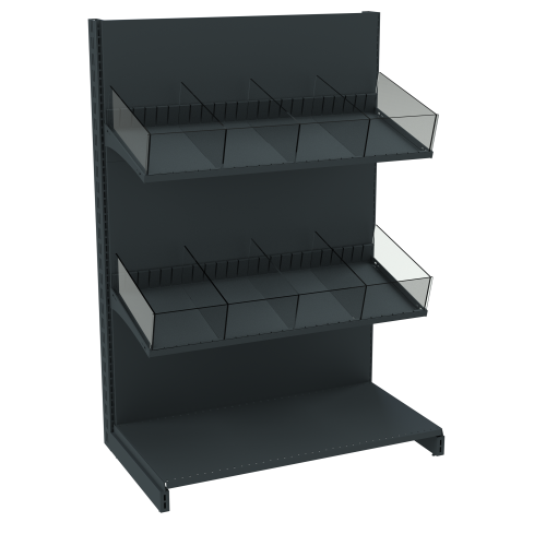 - «Книжная» полка – данный вид предназначен для выкладки товара, расфасованных в коробки или имеющих продолговатую плоскую форму (коробки конфет, шоколадки и т.п.) для их наглядной демонстрации покупателям;