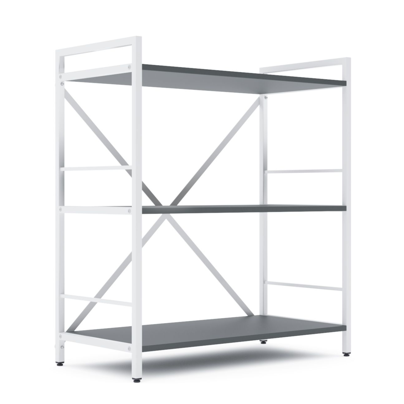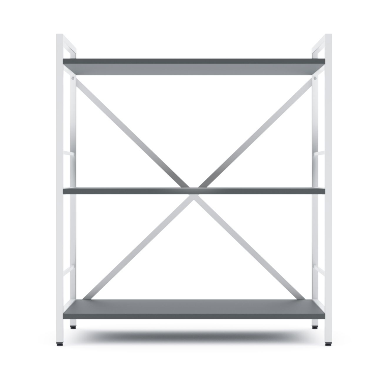 Каркас изготовлен из прочного металла со стальными цельными стойками, которые обеспечивают высокую жесткость и надежность всей конструкции. На задней части стеллажа расположены металлические перекрестные элементы, которые выполняют функцию ребер жесткости — это позволяет сохранять целостность конструкции даже при интенсивной эксплуатации. Изделие устойчиво к деформациям и колебаниям, что особенно важно при размещении тяжелых предметов.