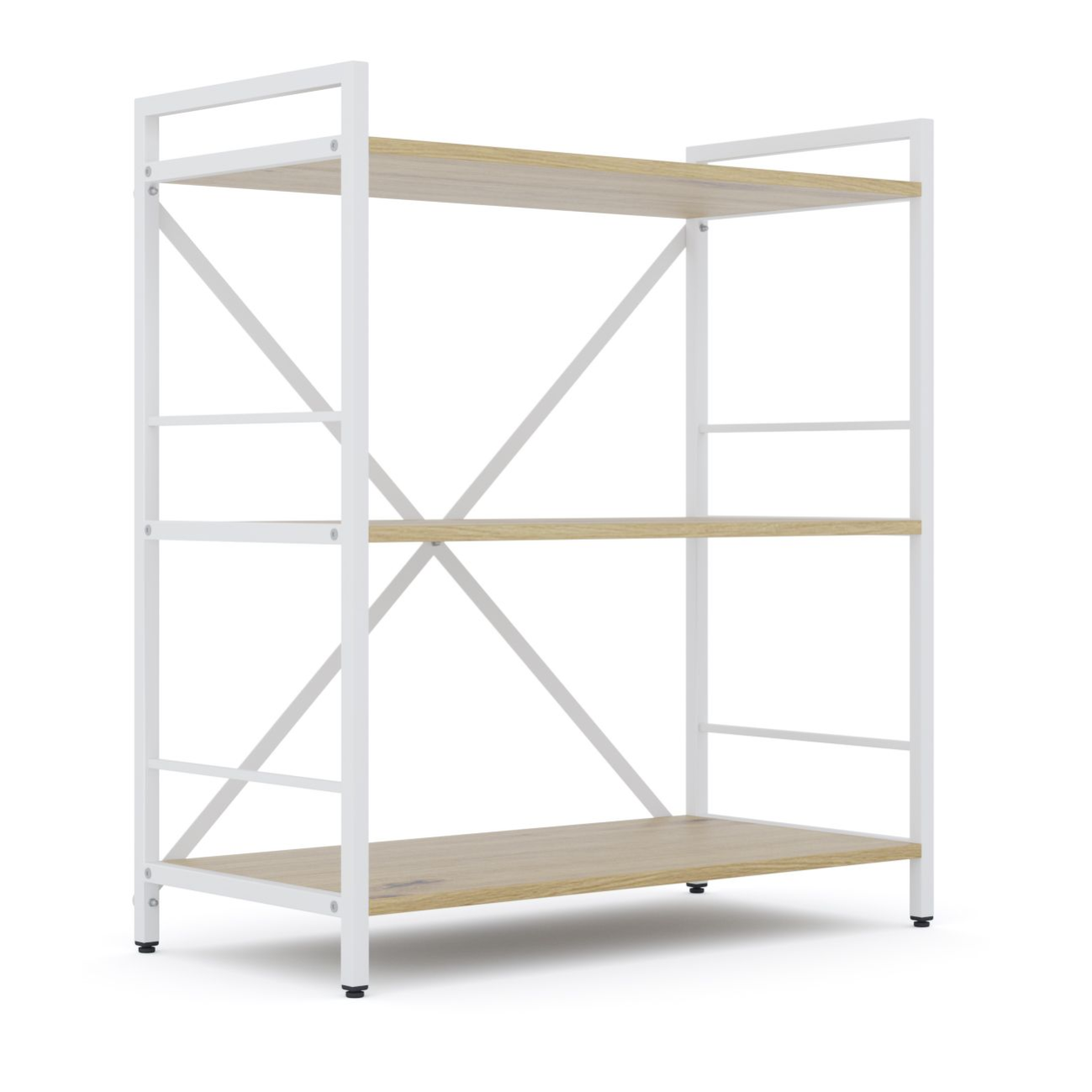Стеллаж имеет три просторные полки, изготовленные из высококачественного ламинированного ДСП, устойчивого к царапинам, влаге и износу. Полки надежно крепятся к конструкции с помощью болтов, что гарантирует стабильность даже при значительной нагрузке.