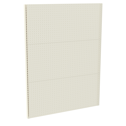 - задняя стенка – составная панель, выступающая в качестве опоры, которая закрывает стену, куда крепится корпус. Стенка вставляется в пазы боковых стоек (реек). Если стеллаж настенный перфорированный, то стенка будет дополнена функциональными пазами для установки дополнительных деталей для вертикальной выкладки штучного товара – крючков, корзинок и пр. Если стеллаж сплошной, задняя вертикальная стенка будет полностью закрывать открытое пространство между стойками;