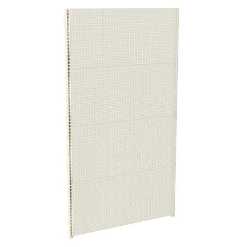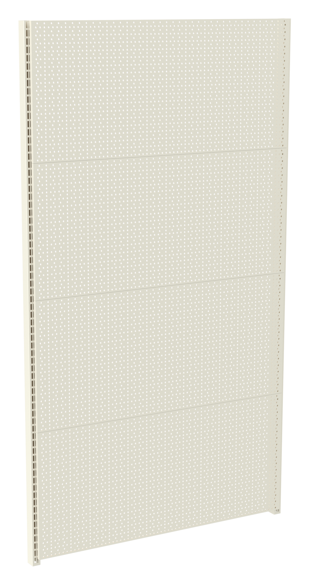 - задняя стенка – составная панель, выступающая в качестве опоры, которая закрывает стену, куда крепится корпус. Стенка вставляется в пазы боковых стоек (реек). Если стеллаж настенный перфорированный, то стенка будет дополнена функциональными пазами для установки дополнительных деталей для вертикальной выкладки штучного товара – крючков, корзинок и пр. Если стеллаж сплошной, задняя вертикальная стенка будет полностью закрывать открытое пространство между стойками;