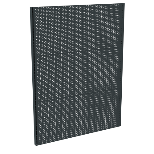 - задняя стенка – составная панель, выступающая в качестве опоры, которая закрывает стену, куда крепится корпус. Стенка вставляется в пазы боковых стоек (реек). Если стеллаж настенный перфорированный, то стенка будет дополнена функциональными пазами для установки дополнительных деталей для вертикальной выкладки штучного товара – крючков, корзинок и пр. Если стеллаж сплошной, задняя вертикальная стенка будет полностью закрывать открытое пространство между стойками;