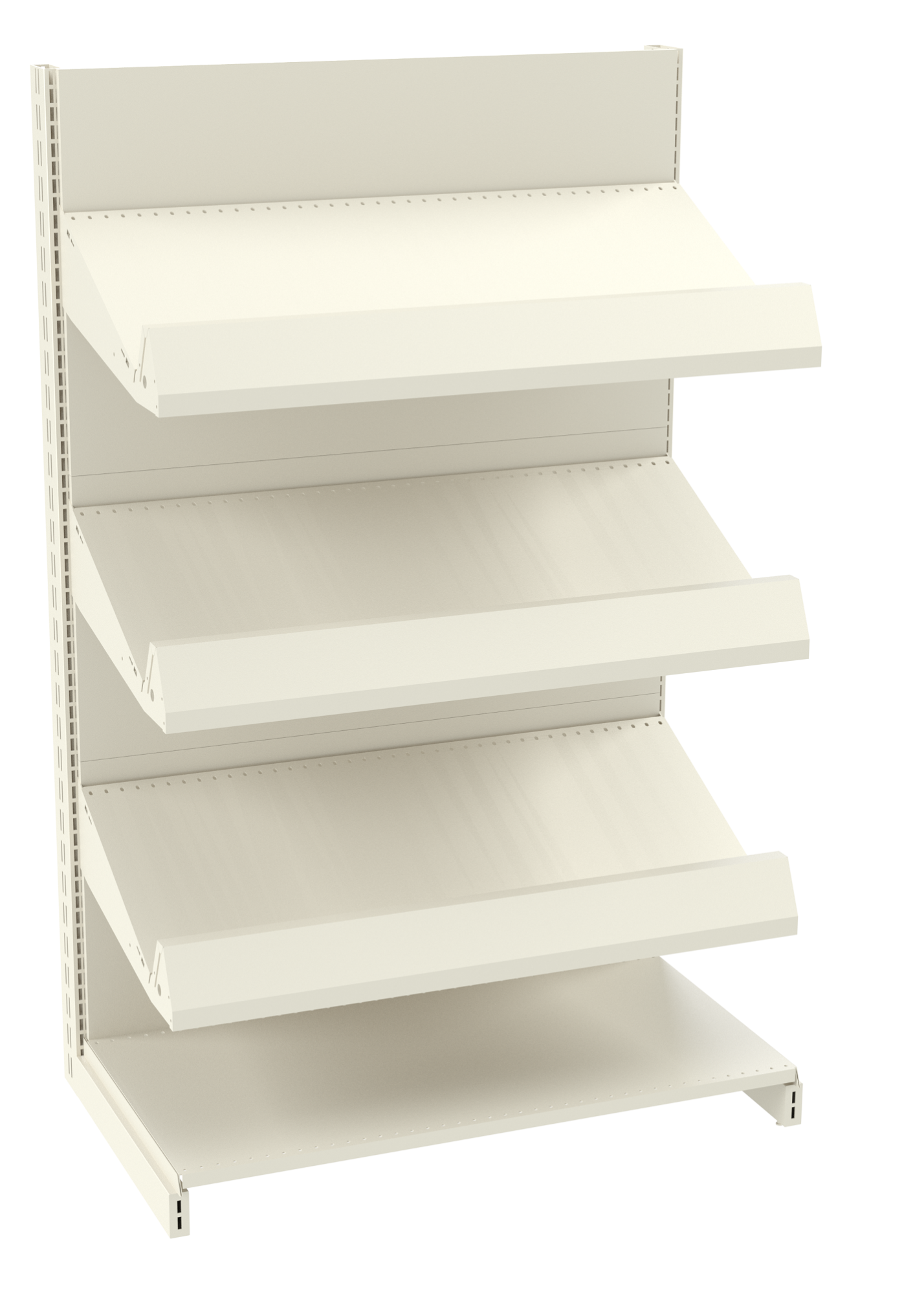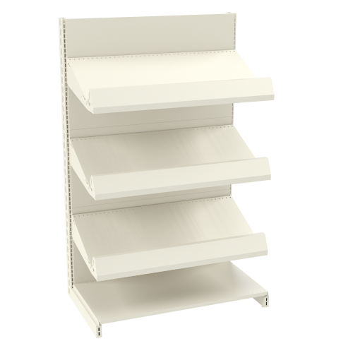 · металлические панели (2 шт.);· ограничитель;· боковые треугольные кронштейны с профильным выступом (изготавливаются из листового металла толщиной 3 мм). Такие кронштейны крепятся как к стойке, так и к основанию;· ребра жесткости (прикручиваются к кронштейнам с помощью винтов).4. Подиум (или нижняя полка) – конструкция подиума такая же, как и у остальных полок. Металлический подиум находится под наклоном и крепится на кронштейны, а не на основание, как у другого торгового оборудования.