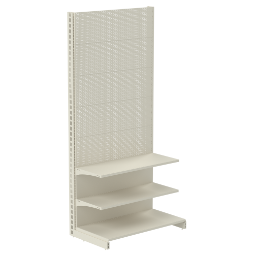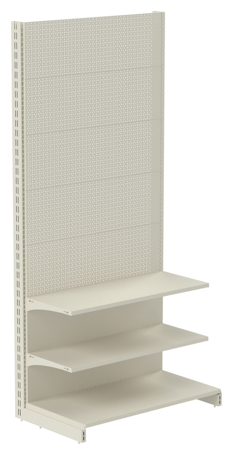 Задняя панель торгового стеллажа, фиксирующаяся между опорными стойками в специальных пазах, может быть изготовлена как в виде сплошного металлического полотна, так и с перфорацией. Стеллаж пристенный перфорированный позволяет дополнять конструкцию вспомогательными навесными элементами для наиболее удобной и компактной выкладки различного товара.