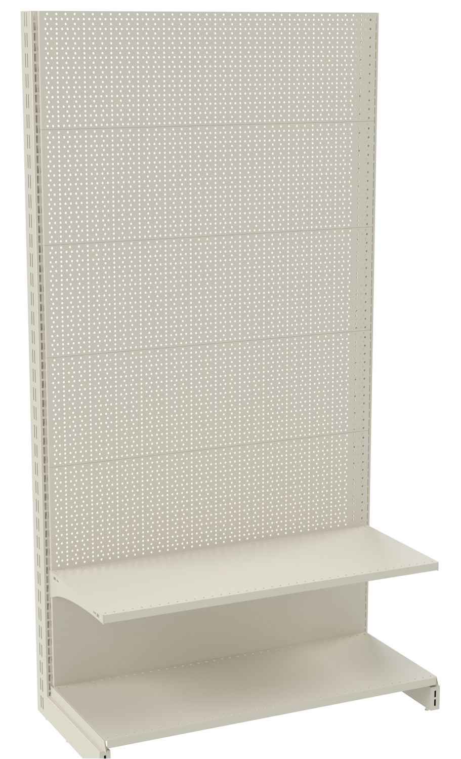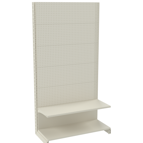 Задняя панель торгового стеллажа, фиксирующаяся между опорными стойками в специальных пазах, может быть изготовлена как в виде сплошного металлического полотна, так и с перфорацией. Стеллаж пристенный перфорированный позволяет дополнять конструкцию вспомогательными навесными элементами для наиболее удобной и компактной выкладки различного товара.