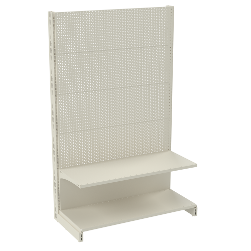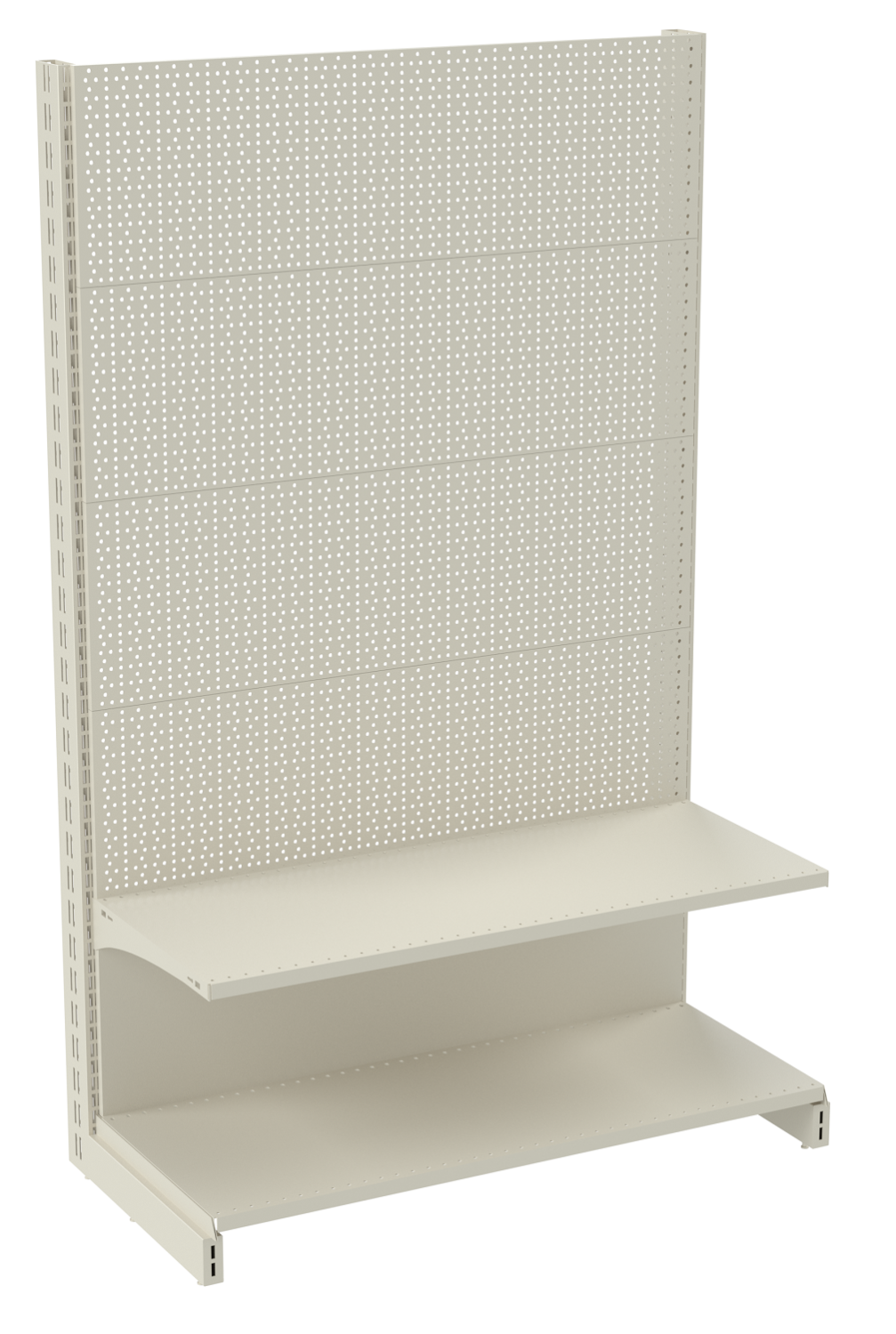 Задняя панель торгового стеллажа, фиксирующаяся между опорными стойками в специальных пазах, может быть изготовлена как в виде сплошного металлического полотна, так и с перфорацией. Стеллаж пристенный перфорированный позволяет дополнять конструкцию вспомогательными навесными элементами для наиболее удобной и компактной выкладки различного товара.