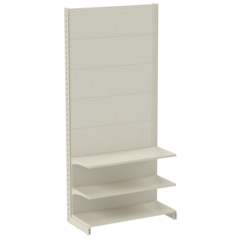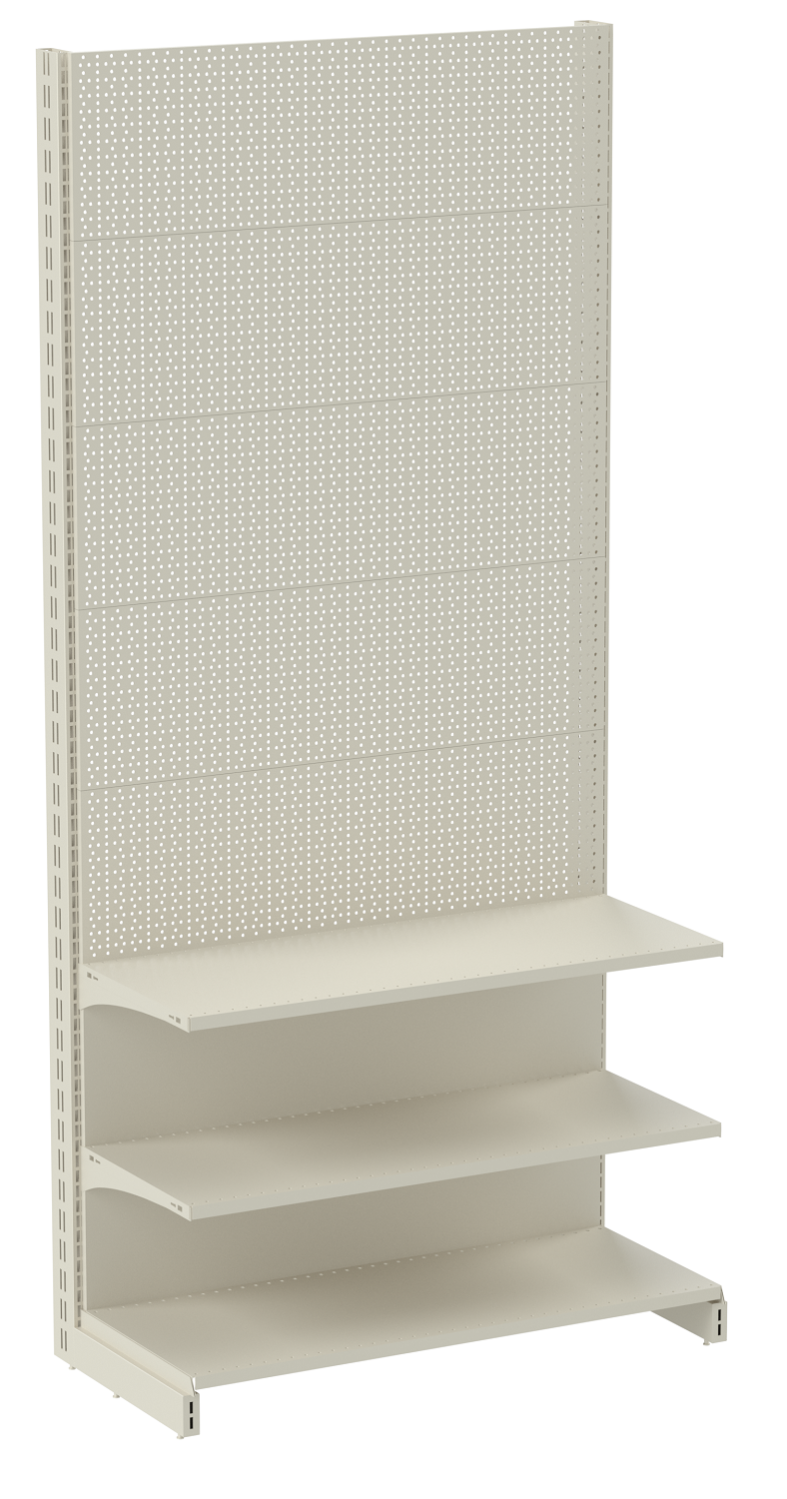 Задняя панель торгового стеллажа, фиксирующаяся между опорными стойками в специальных пазах, может быть изготовлена как в виде сплошного металлического полотна, так и с перфорацией. Стеллаж пристенный перфорированный позволяет дополнять конструкцию вспомогательными навесными элементами для наиболее удобной и компактной выкладки различного товара.