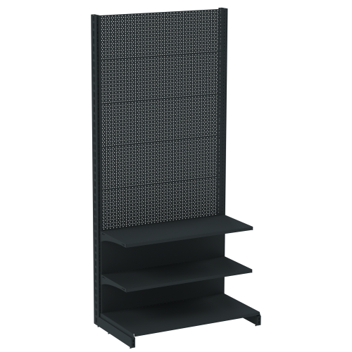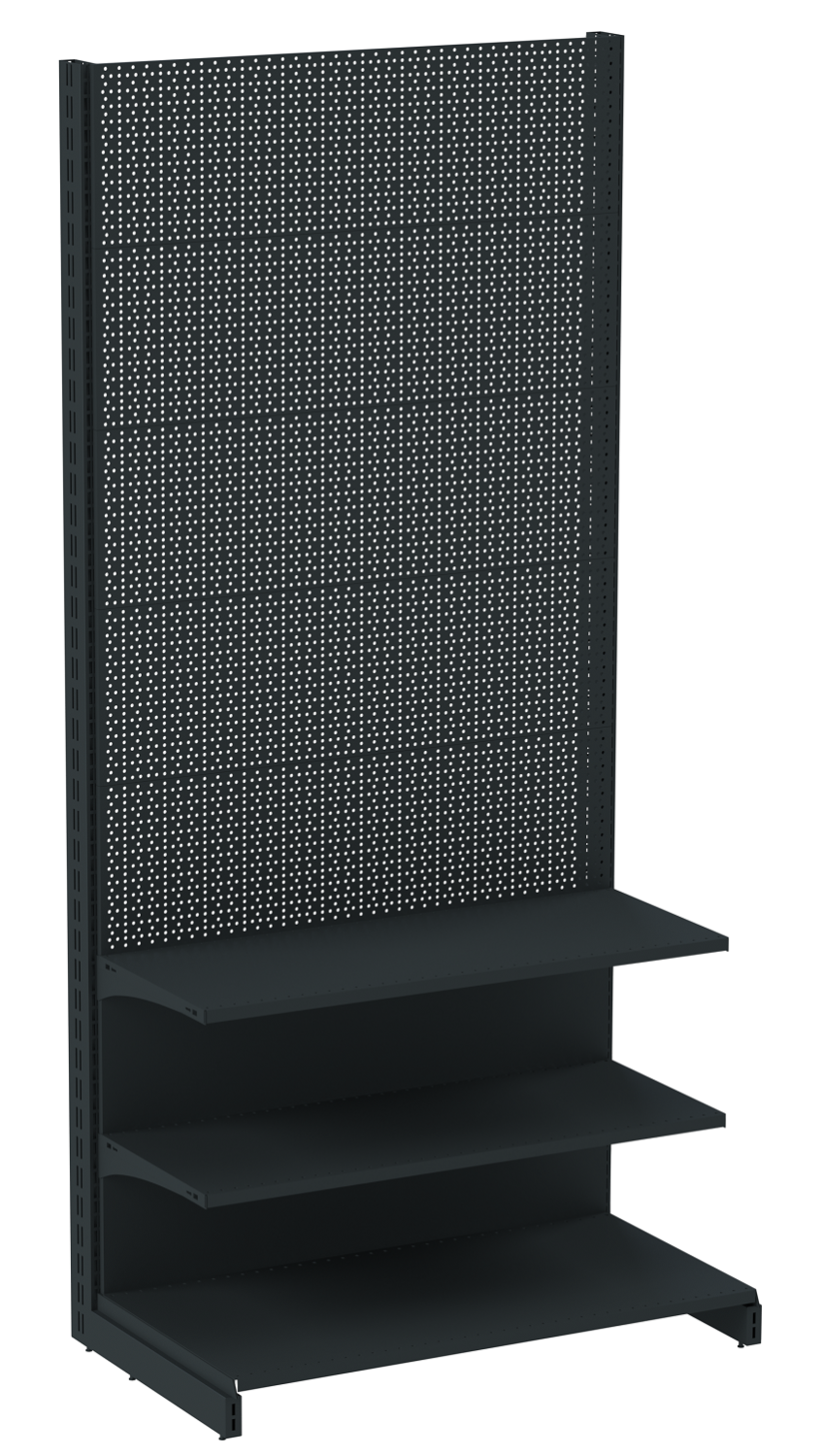 Задняя панель торгового стеллажа, фиксирующаяся между опорными стойками в специальных пазах, может быть изготовлена как в виде сплошного металлического полотна, так и с перфорацией. Стеллаж пристенный перфорированный позволяет дополнять конструкцию вспомогательными навесными элементами для наиболее удобной и компактной выкладки различного товара.