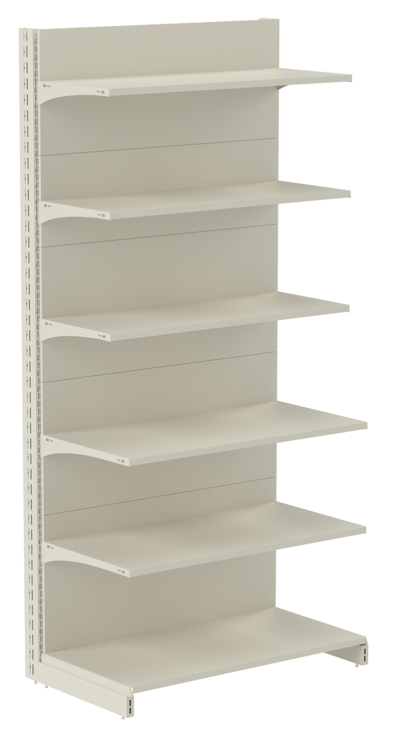 Задняя панель торгового стеллажа, фиксирующаяся между опорными стойками в специальных пазах, может быть изготовлена как в виде сплошного металлического полотна, так и с перфорацией. Стеллаж пристенный перфорированный позволяет дополнять конструкцию вспомогательными навесными элементами для наиболее удобной и компактной выкладки различного товара.
