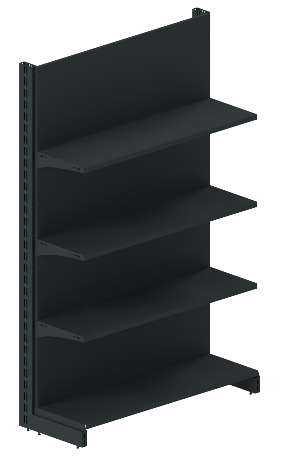 Задняя панель торгового стеллажа, фиксирующаяся между опорными стойками в специальных пазах, может быть изготовлена как в виде сплошного металлического полотна, так и с перфорацией. Стеллаж пристенный перфорированный позволяет дополнять конструкцию вспомогательными навесными элементами для наиболее удобной и компактной выкладки различного товара.