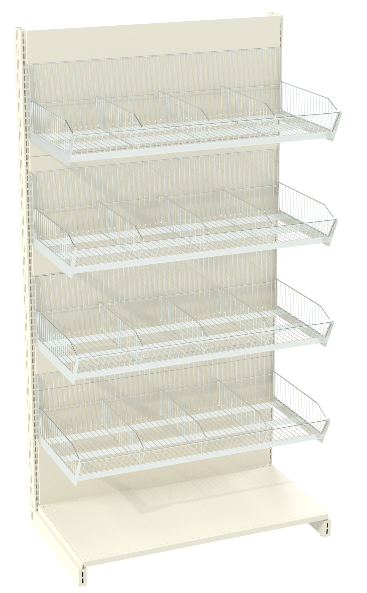Стеллаж металлический с корзинами состоит из устойчивого основания (она же – нижняя полка, подиум с максимально возможной нагрузкой на стеллаж), задней стенки с вертикальными стойками, а также различных навесных элементов. Задняя стенка может быть сплошной или сетчатой, но при желании сделать данное оборудование бюджетнее, стеллажи можно устанавливать без задних стенок, но с использованием стяжек. Стяжки не видны за корзинами и товаром и создается впечатление абсолютно легкого, невесомого, полностью просматриваемого стеллажа. Такой вариант отлично подойдет для островных стеллажей, а также для пристенных, если есть желание или необходимость открыть стену помещения (чаще всего это становится возможным, если интерьер оформлен дизайнерами в стилях лофт, модерн и прочих, где стена, как фон, подчеркивает товарный вид оборудования).