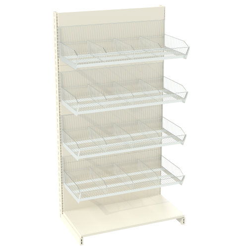 Преимущество такого стеллажа в одновременном представлении многочисленного вида продукции, комфортном хранении, легком доступе к товару. На перфорированные стойки возможно установить не только корзины, но и полки, крючки, что делает этот вид стеллажного оборудования незаменимым атрибутом торгового помещения.