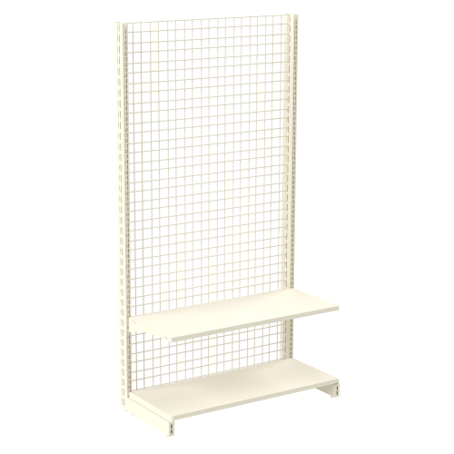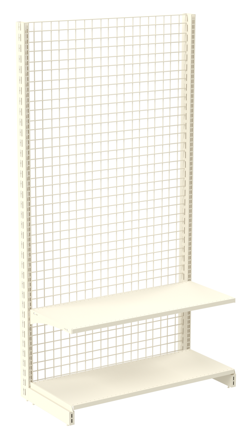 · Модульные стенки сетки, которые можно объединить в одну линию с помощью специальных стяжек.Стандартная конструкция сетчатого стеллажаВсе торговые сетчатые стеллажи обладают одной общей чертой – задней проволочной стенкой с довольно крупной ячейкой, как правило 50х50 мм. В зависимости от модели оборудования сетка может закрывать как определенный участок, так и всю заднюю часть. Среди основных элементов такого стеллажа стоит выделить:1. Опорные стойки – две стойки, которые складываются из вертикальных и горизонтальных опор. Стойки могут быть выполнены их профиля с перфорацией для крепления других элементов оборудования. Горизонтальное основание (подиум), устанавливаемый на нижнюю опору стоек, в зависимости от модели может стоять на регулируемых ножках (по высоте) или колесиках;
