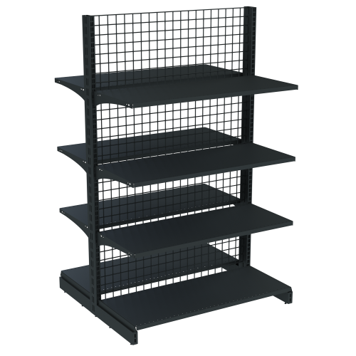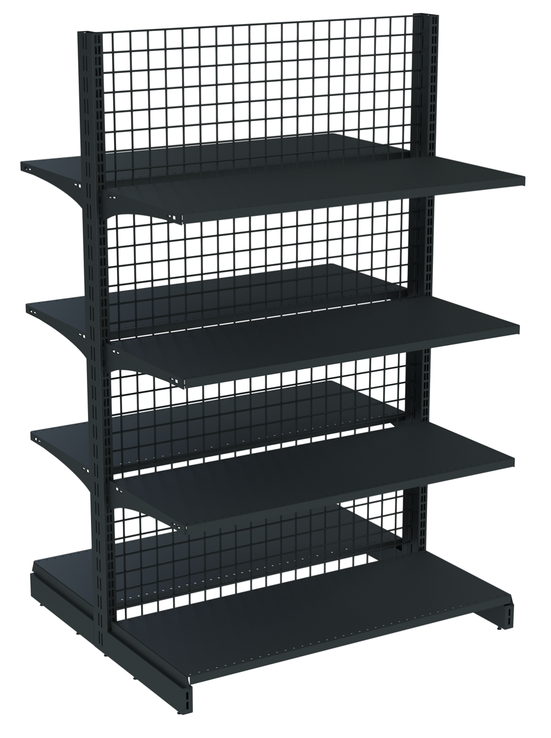 · Модульные стенки сетки, которые можно объединить в одну линию с помощью специальных стяжек.Стандартная конструкция сетчатого стеллажаВсе торговые сетчатые стеллажи обладают одной общей чертой – задней проволочной стенкой с довольно крупной ячейкой, как правило 50х50 мм. В зависимости от модели оборудования сетка может закрывать как определенный участок, так и всю заднюю часть. Среди основных элементов такого стеллажа стоит выделить:1. Опорные стойки – две стойки, которые складываются из вертикальных и горизонтальных опор. Стойки могут быть выполнены их профиля с перфорацией для крепления других элементов оборудования. Горизонтальное основание (подиум), устанавливаемый на нижнюю опору стоек, в зависимости от модели может стоять на регулируемых ножках (по высоте) или колесиках;