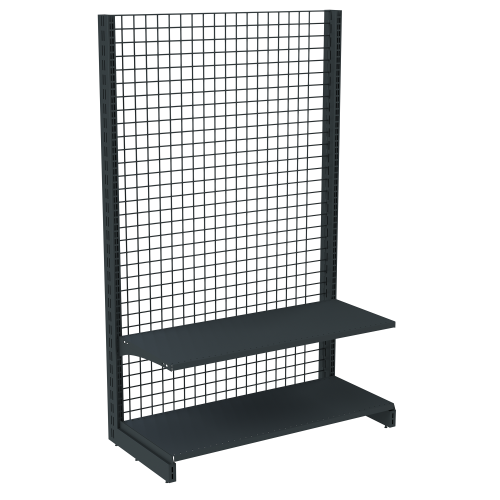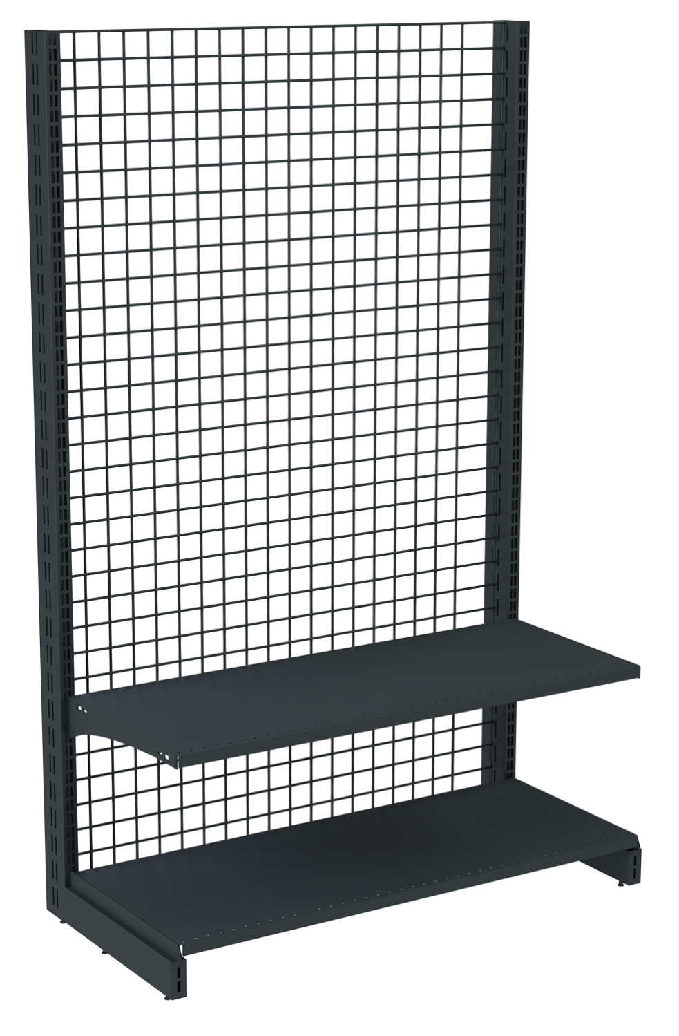 · Модульные стенки сетки, которые можно объединить в одну линию с помощью специальных стяжек.Стандартная конструкция сетчатого стеллажаВсе торговые сетчатые стеллажи обладают одной общей чертой – задней проволочной стенкой с довольно крупной ячейкой, как правило 50х50 мм. В зависимости от модели оборудования сетка может закрывать как определенный участок, так и всю заднюю часть. Среди основных элементов такого стеллажа стоит выделить:1. Опорные стойки – две стойки, которые складываются из вертикальных и горизонтальных опор. Стойки могут быть выполнены их профиля с перфорацией для крепления других элементов оборудования. Горизонтальное основание (подиум), устанавливаемый на нижнюю опору стоек, в зависимости от модели может стоять на регулируемых ножках (по высоте) или колесиках;