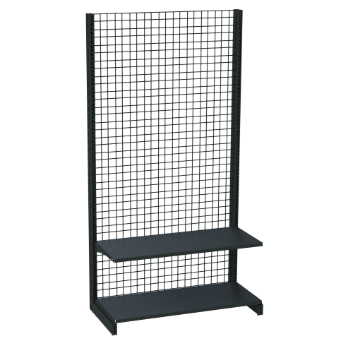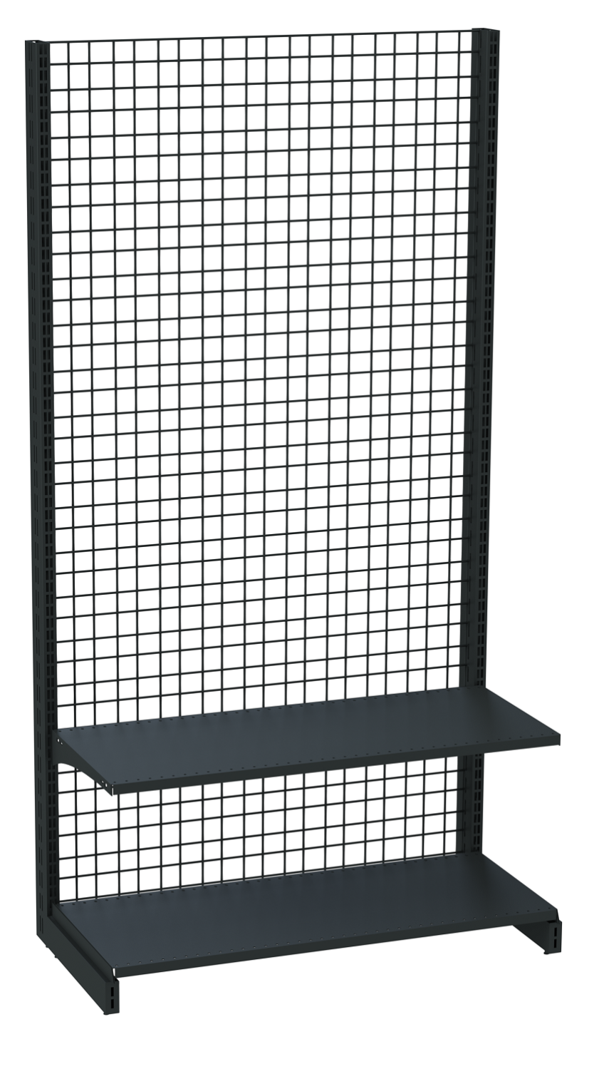 · Модульные стенки сетки, которые можно объединить в одну линию с помощью специальных стяжек.Стандартная конструкция сетчатого стеллажаВсе торговые сетчатые стеллажи обладают одной общей чертой – задней проволочной стенкой с довольно крупной ячейкой, как правило 50х50 мм. В зависимости от модели оборудования сетка может закрывать как определенный участок, так и всю заднюю часть. Среди основных элементов такого стеллажа стоит выделить:1. Опорные стойки – две стойки, которые складываются из вертикальных и горизонтальных опор. Стойки могут быть выполнены их профиля с перфорацией для крепления других элементов оборудования. Горизонтальное основание (подиум), устанавливаемый на нижнюю опору стоек, в зависимости от модели может стоять на регулируемых ножках (по высоте) или колесиках;