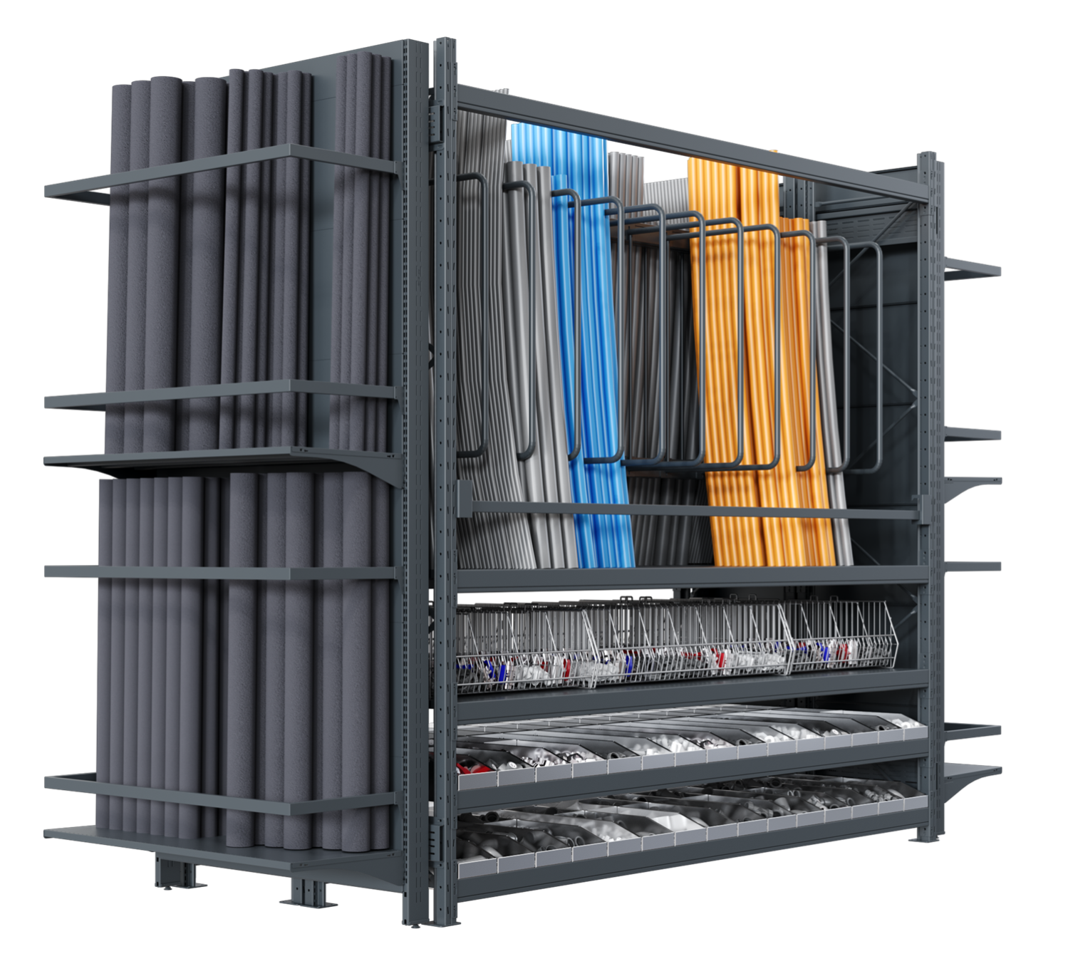 - Прочность и долговечность:Наши стеллажи изготовлены из высококачественного металла, что гарантирует их прочность и способность выдерживать большие нагрузки. Они идеально подходят для хранения тяжелых сантехнических товаров, таких как трубопроводы или сантехнические инструменты, что обеспечивает их долговечность.