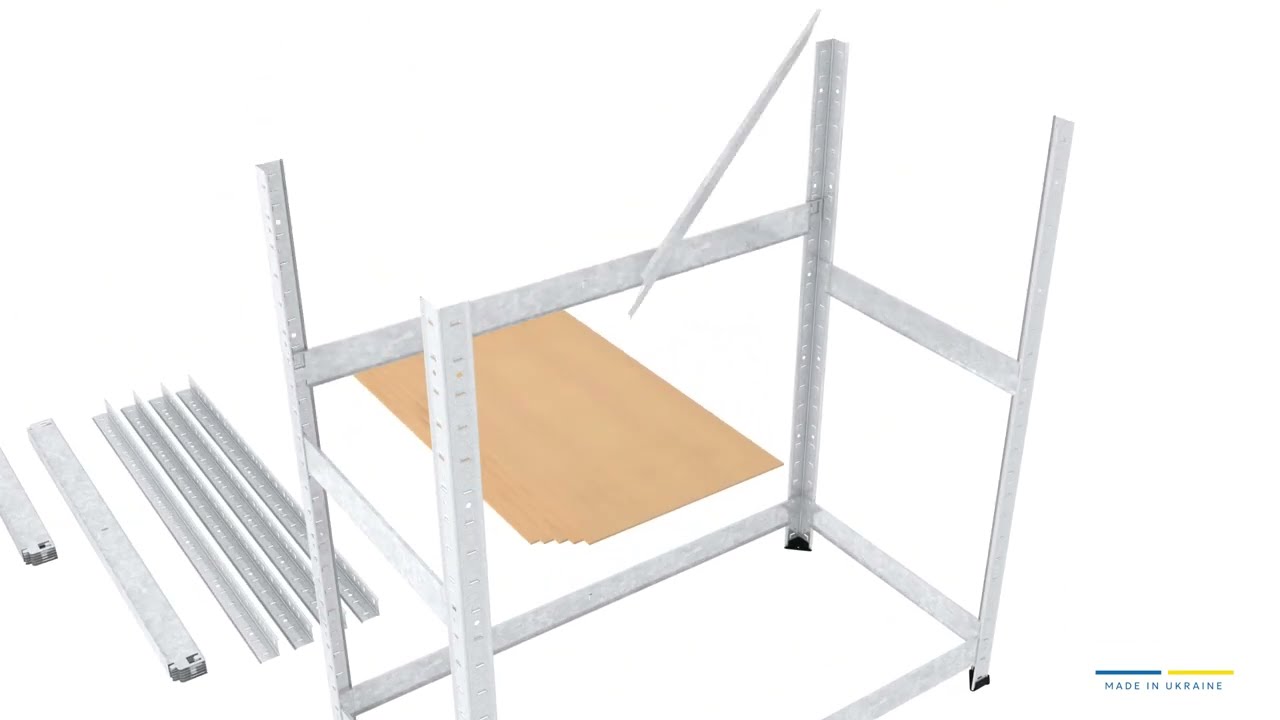 четыре вертикальные стойки из оцинкованного стального профиля, с перфорацией на внутренних гранях, которая образует зацепы;