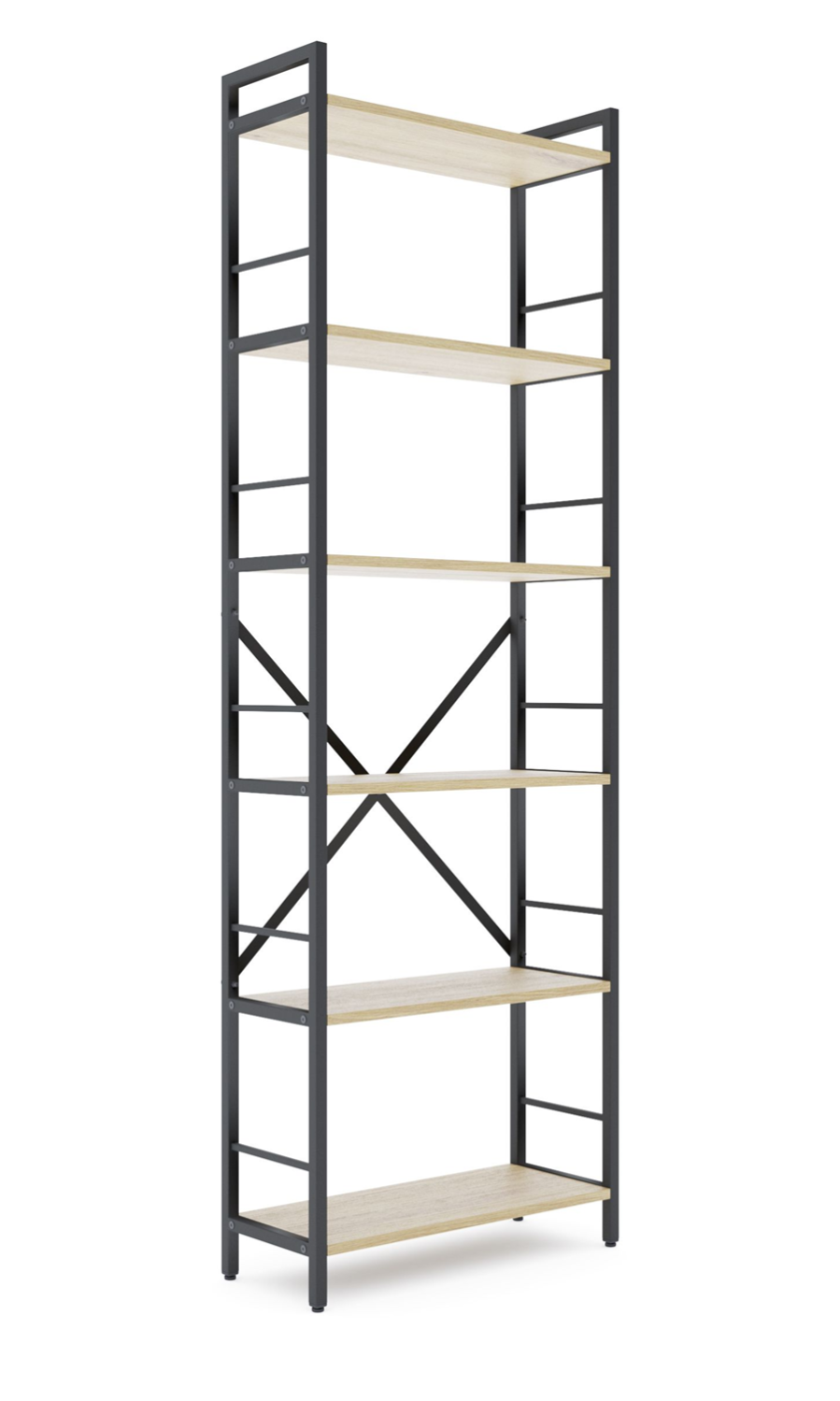 Каркас изготовлен из прочного металла со стальными цельными стойками, которые обеспечивают высокую жесткость и надежность всей конструкции. На задней части стеллажа расположены металлические перекрестные элементы, которые выполняют функцию ребер жесткости — это позволяет сохранять целостность конструкции даже при интенсивной эксплуатации. Изделие устойчиво к деформациям и колебаниям, что особенно важно при размещении тяжелых предметов.