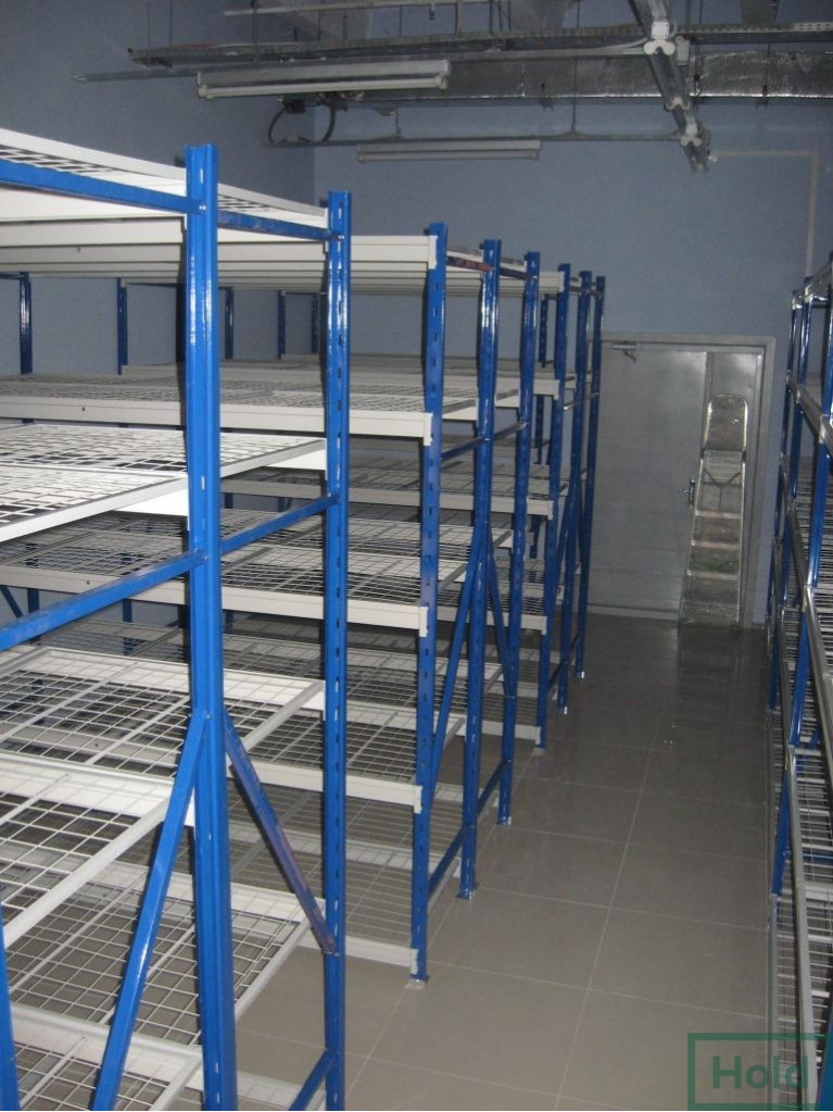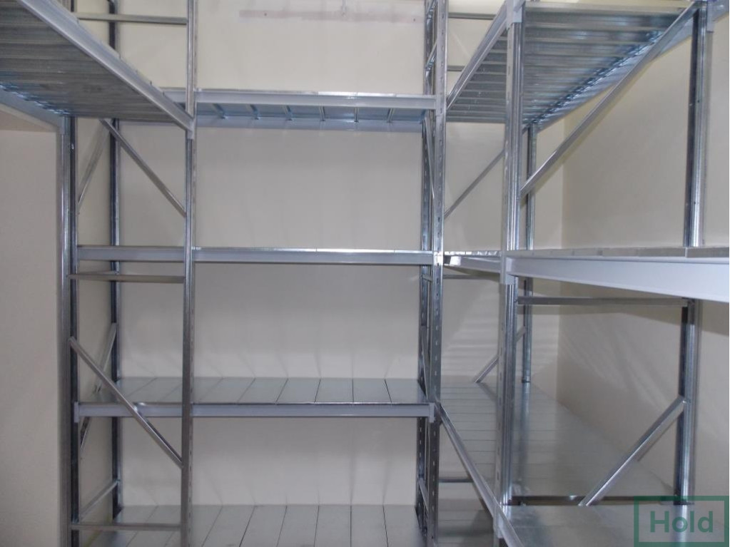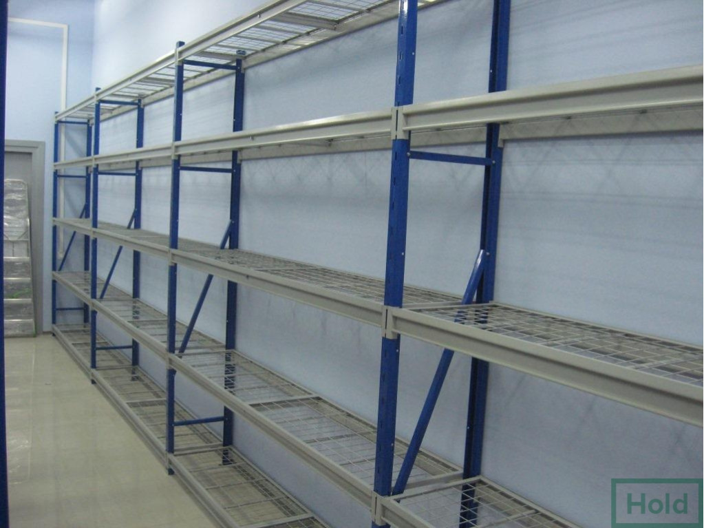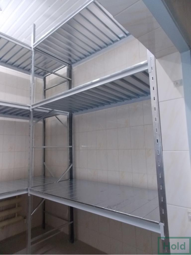 - Полки выпускаются в двух вариантах: металлические и полки ДСП. Последние не рекомендуется использовать в помещениях с повышенной влажностью, а также хранить на них жидкости и смеси, в остальном они дешевле металлических и выдерживают аналогичные веса. Металлические полки покрывают порошковой краской или оцинковкой. Порошковая краска считается универсальной и может быть подобрана в любой цветовой гамме. Укладываются полки на траверсы, которые в свою очередь имеют различные выступы для различных полок (ступенчатые и прямоугольные сечения). Под полками устанавливают перемычки, которые исключают прогиб.