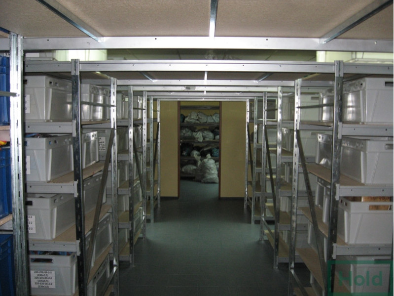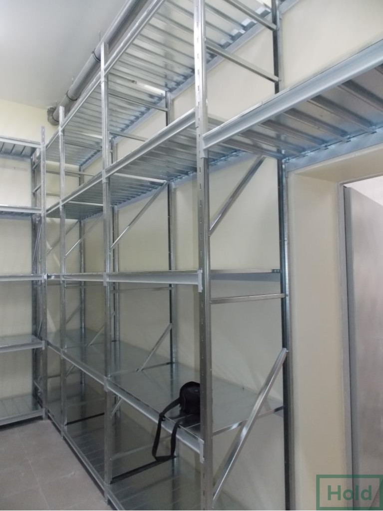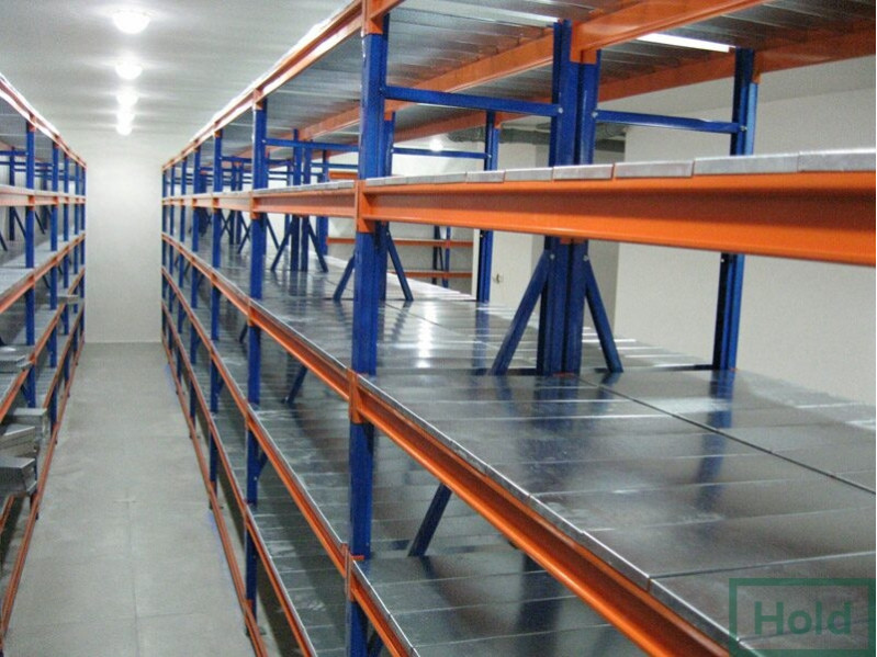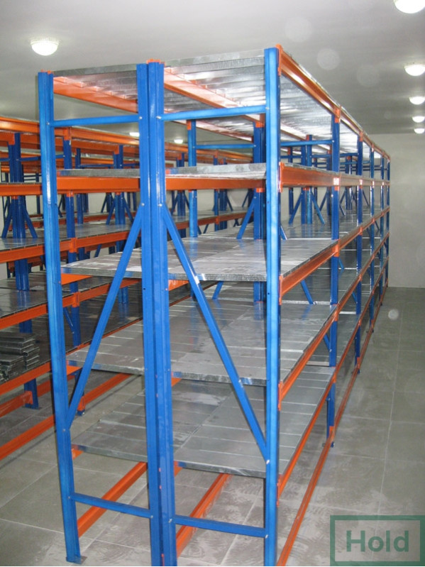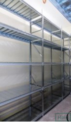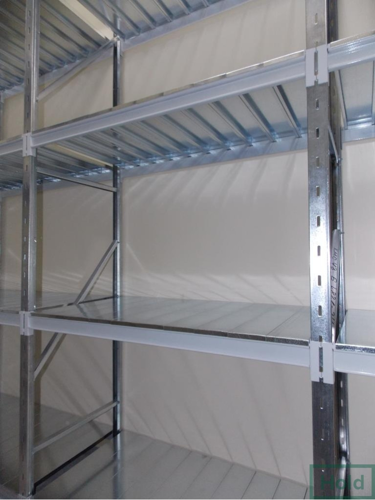- Полки выпускаются в двух вариантах: металлические и полки ДСП. Последние не рекомендуется использовать в помещениях с повышенной влажностью, а также хранить на них жидкости и смеси, в остальном они дешевле металлических и выдерживают аналогичные веса. Металлические полки покрывают порошковой краской или оцинковкой. Порошковая краска считается универсальной и может быть подобрана в любой цветовой гамме. Укладываются полки на траверсы, которые в свою очередь имеют различные выступы для различных полок (ступенчатые и прямоугольные сечения). Под полками устанавливают перемычки, которые исключают прогиб.