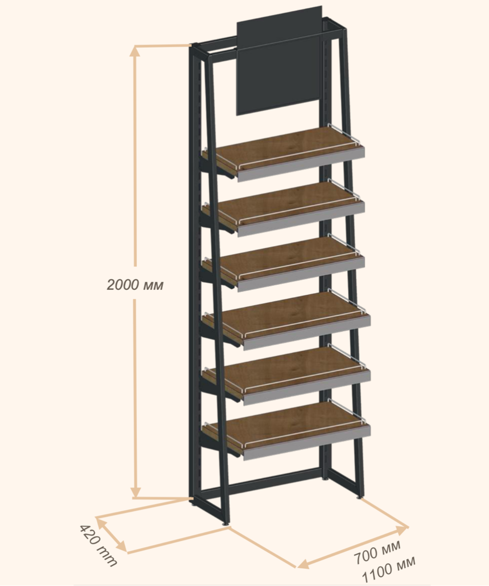 | Комплектация | каркас из трубы 40х40 мм; полки из ДСП; проволочные ограничители на полках; панель рекламная |
