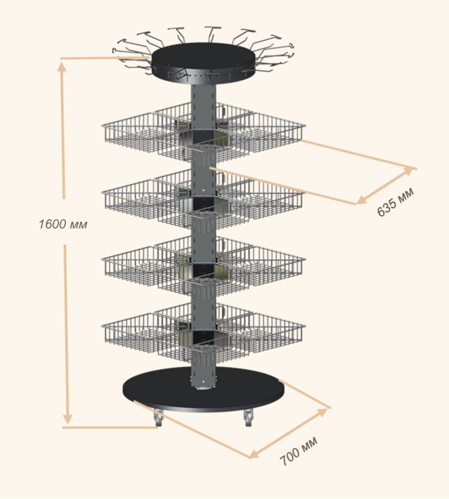 - Регулировка корзин по высоте для адаптации под различные товары.