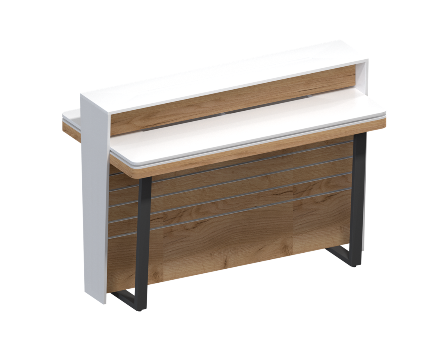 - Двухсторонний дизайн: Обеспечивает возможность демонстрации товаров с обеих сторон стола, увеличивая видимость товаров для клиентов, столешница из окрашеного МДФ.