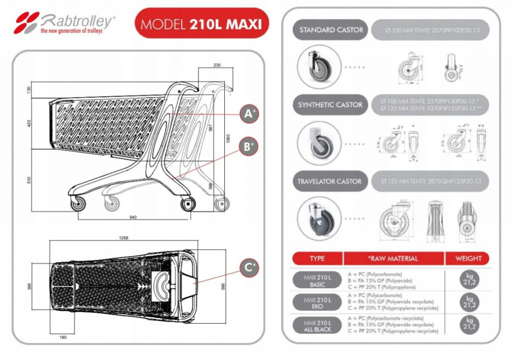 | Дополнительно | тележка изготовлена из пластика; корзина тележки - из поликарбоната, очень элегантного материала с превосходными механическими свойствами; тележка характеризуется высокой прочностью и большой вместимостью; несмотря на большую вместимость и размер, является легкой, благодаря чему ею очень легко маневрировать даже при загруженной корзине |