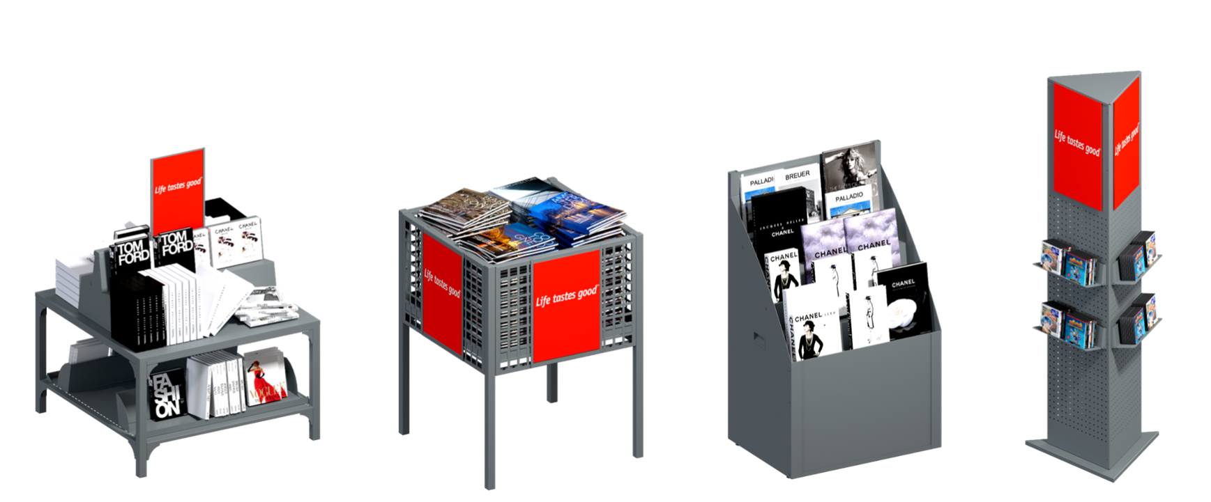 Стенды для книг. Такой тип оборудования часто бывает в виде столов-островков и позволяет демонстрировать обложки большого количества книг.