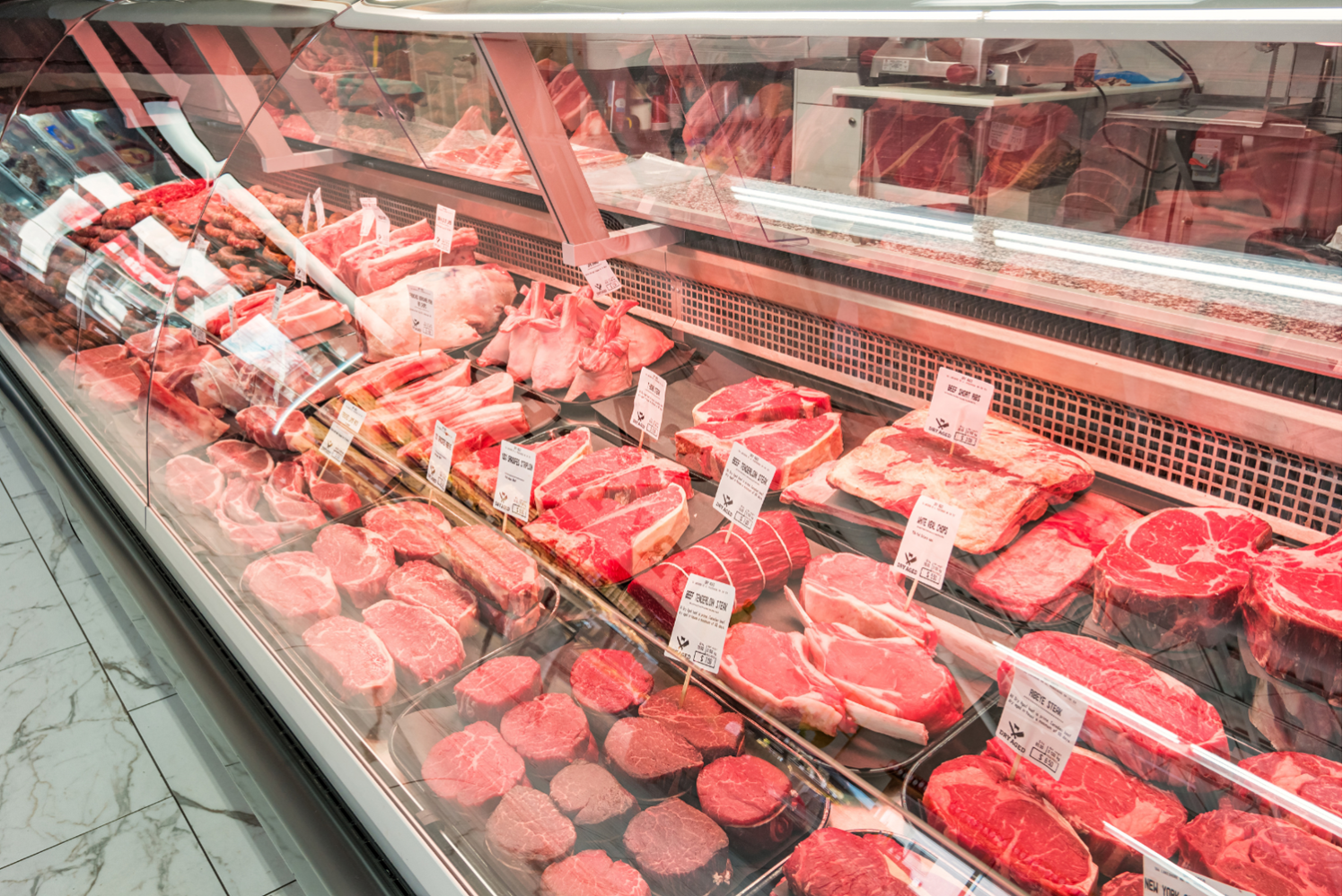 Следующей зоной в витрине являются мясные деликатесы и колбасные изделия. Они размещаются так, чтобы подчеркнуть их свежесть и премиальное качество.