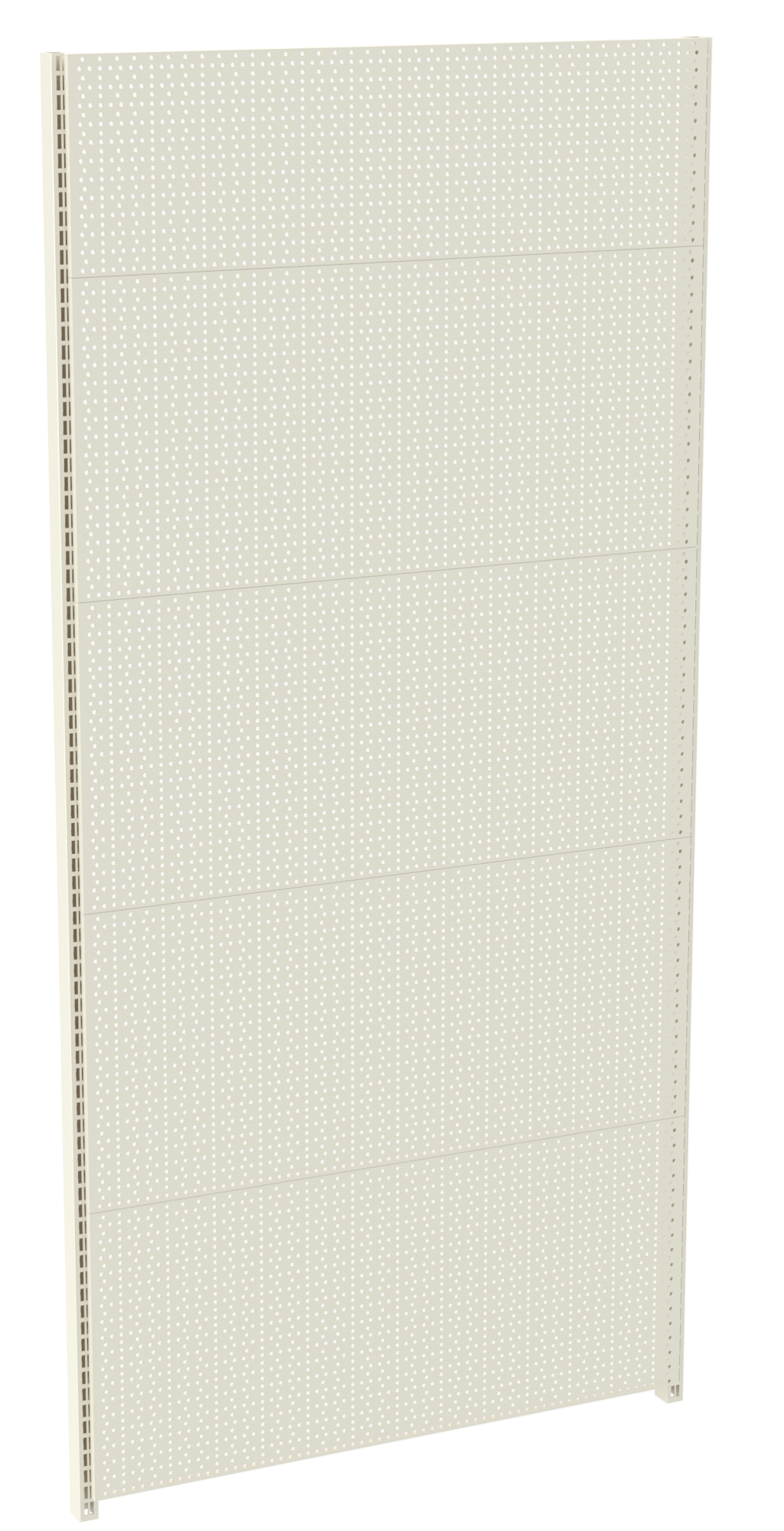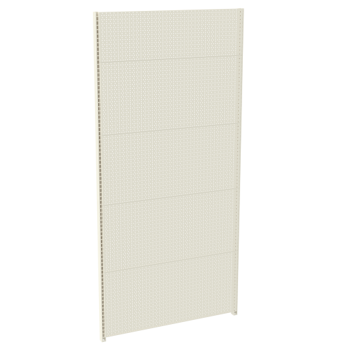 - задня стінка – складова панель, що виступає як опора, яка закриває стіну, куди кріпиться корпус. Стінка вставляється в пази бічних стійок (рейок). Якщо настінний стелаж перфорований, то стінка буде доповнена функціональними пазами для встановлення додаткових деталей для вертикальної викладки штучного товару – гачків, кошиків тощо. Якщо стелаж суцільний, задня вертикальна стінка повністю закриватиме відкритий простір між стійками;