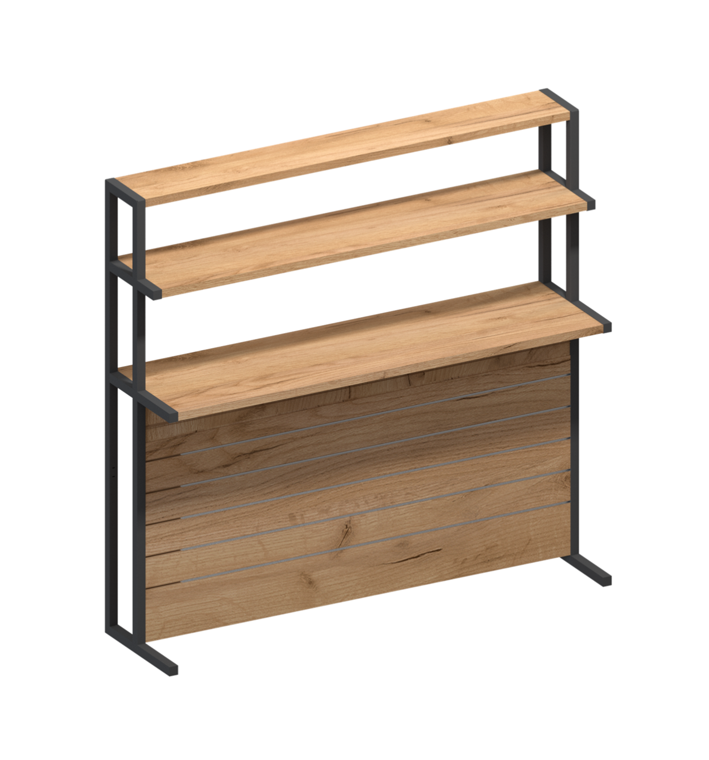 - Трирівнева конструкція: стенд має три рівні, що дозволяє ефективно використовувати вертикальний простір магазину та надає більше місця для демонстрації товарів.
