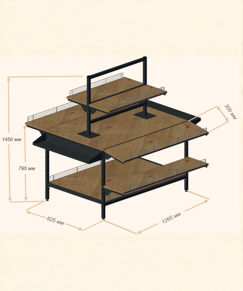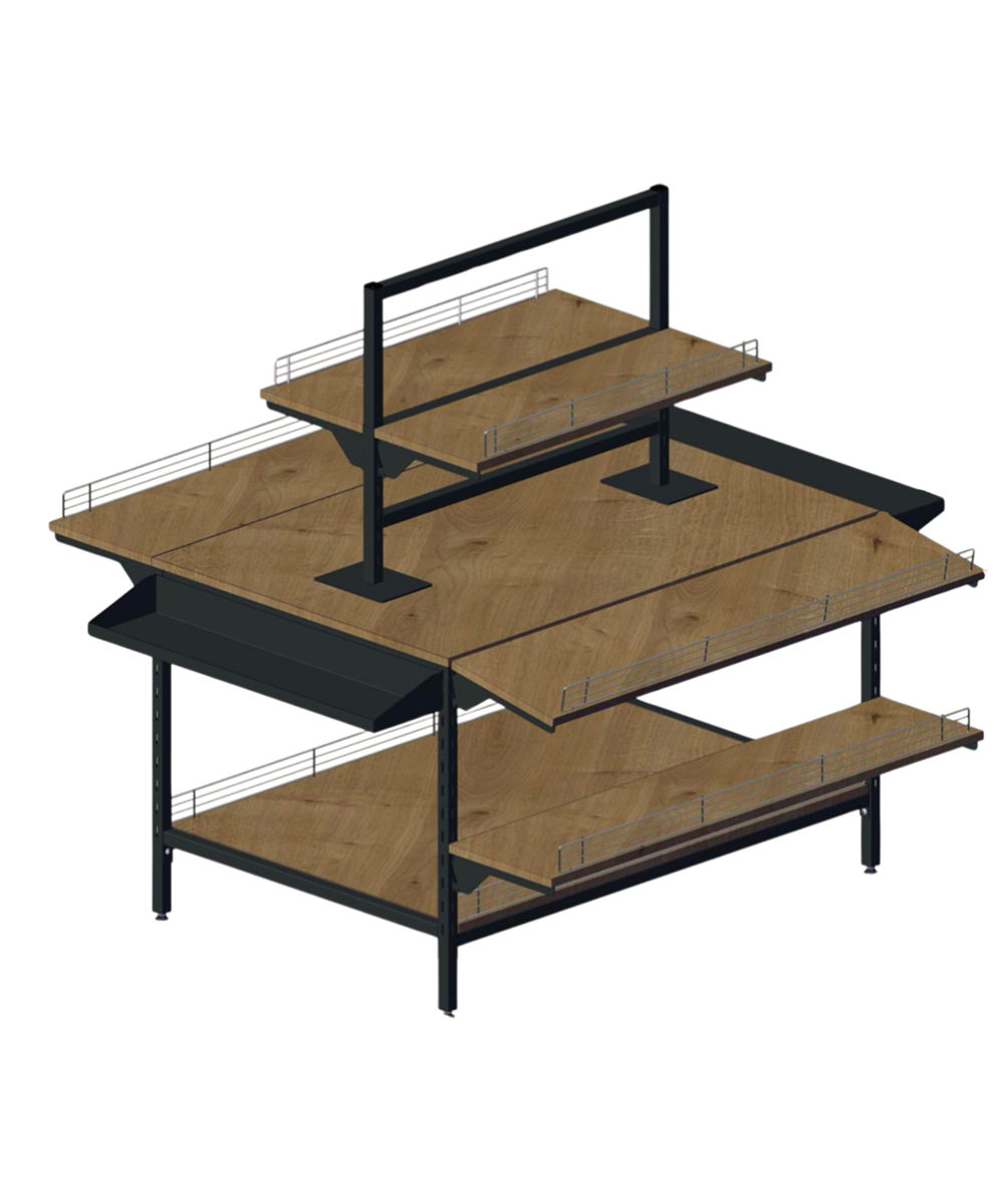 Багатофункціональний стіл — це сучасне торговельне обладнання, розроблене для ефектної викладки товарів у магазинах одягу, взуття та аксесуарів. Конструкція поєднує стильний дизайн і максимальну практичність, дозволяючи демонструвати продукцію на кількох рівнях, створюючи візуально привабливі експозиції.