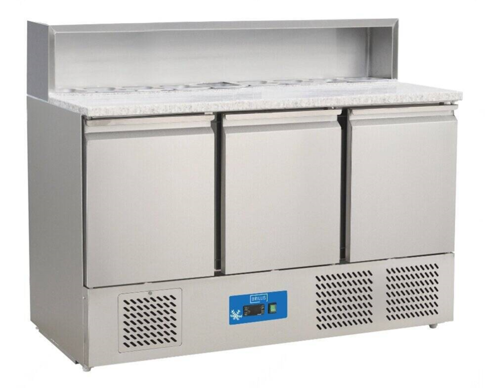 Тридверний холодильний стіл для піци BRILLIS G-PS903V - це практичне рішення для професійної кухні, яке поєднує одночасно зручне зберігання інгредієнтів і комфортну поверхню для приготування страв, допомагаючи раціонально використовувати робочий простір та підвищити продуктивність персоналу.