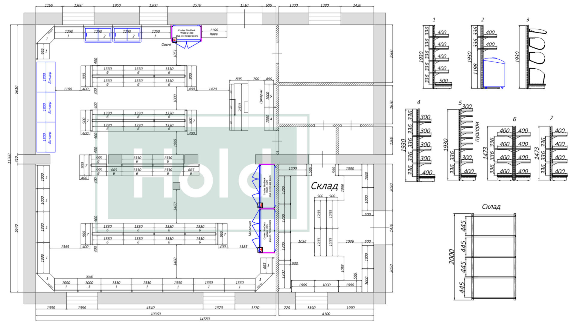 - Формат: магазин возле дома (мини-маркет) – 118 м² торговый зал, 22 м² склад;