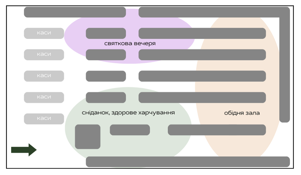В продовольственных супермаркетах товары традиционно группируются в пять основных категорий: овощи/фрукты, молочные продукты, хлеб, мясо/рыба и алкоголь. На базе этих категорий формируются специализированные зоны, каждая из которых предназначена для удовлетворения конкретных потребностей покупателей и стимулирования дополнительных продаж.